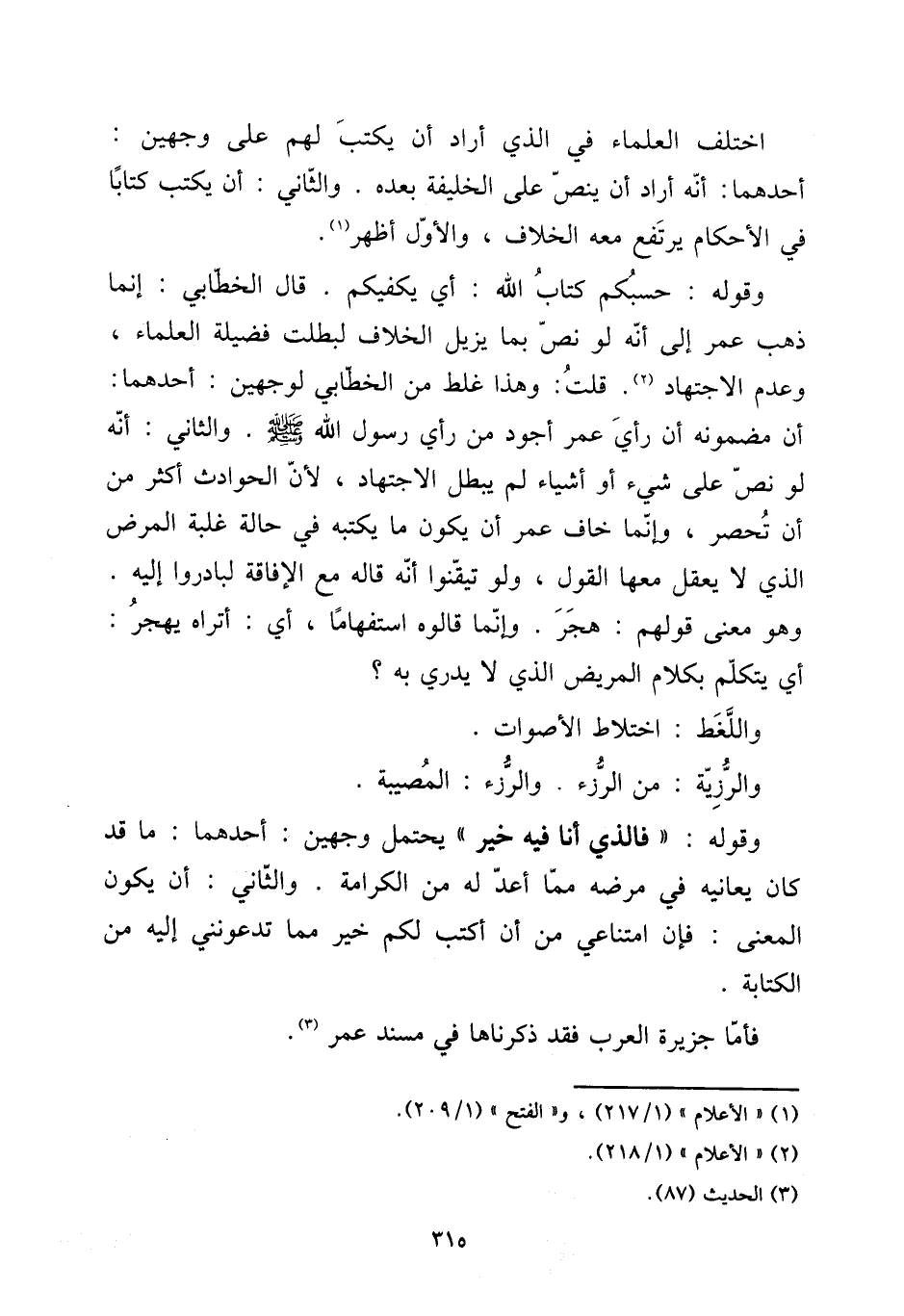 [15] اخْتلف الْعلمَاء فِي الَّذِي أَرَادَ أَن يكْتب لَهُم على وَجْهَيْن: أَحدهمَا: أَنه أَرَادَ أَن ينص على الْخَلِيفَة بعده. وَالثَّانِي: أَن يكْتب كتابا فِي الْأَحْكَام يرْتَفع مَعَه الْخلاف، وَالْأول أظهر. [15] وَقَوله: حسبكم كتاب الله: أَي يكفيكم. قَالَ الْخطابِيّ: إِنَّمَا ذهب عمر إِلَى أَنه لَو نَص بِمَا يزِيل الْخلاف لبطلت فَضِيلَة الْعلمَاء، وَعدم الِاجْتِهَاد. قلت: وَهَذَا غلط من الْخطابِيّ لوَجْهَيْنِ: أَحدهمَا: أَن مضمونه أَن رَأْي عمر أَجود من رَأْي رَسُول الله صلى الله عَلَيْهِ وَسلم. وَالثَّانِي: أَنه لَو نَص على شَيْء أَو أَشْيَاء لم يبطل الِاجْتِهَاد، لِأَن الْحَوَادِث أَكثر من أَن تحصر، وَإِنَّمَا خَافَ عمر أَن يكون مَا يَكْتُبهُ فِي حَالَة غَلَبَة الْمَرَض الَّذِي لَا يعقل مَعهَا القَوْل، وَلَو تيقنوا أَنه قَالَ مَعَ الْإِفَاقَة لبادروا إِلَيْهِ. وَهُوَ معنى قَوْلهم: هجر. وَإِنَّمَا قَالُوهُ استفهاما، أَي: أتراه يهجر: أَي يتَكَلَّم بِكَلَام الْمَرِيض الَّذِي لَا يدْرِي بِهِ؟ [15] واللغط: اخْتِلَاط الْأَصْوَات. [15] والرزية: من الرزء. والرزء: الْمُصِيبَة. [15] وَقَوله: " فَالَّذِي أَنا فِيهِ خير " يحْتَمل وَجْهَيْن: أَحدهمَا: مَا قد كَانَ يعانيه فِي مَرضه مِمَّا أعد لَهُ من الْكَرَامَة. وَالثَّانِي: أَن يكون الْمَعْنى: فَإِن امتناعي من أَن أكتب لكم خير مِمَّا تدعونني إِلَيْهِ من الْكِتَابَة. فَأَما جَزِيرَة الْعَرَب فقد ذَكرنَاهَا فِي مُسْند عمر.