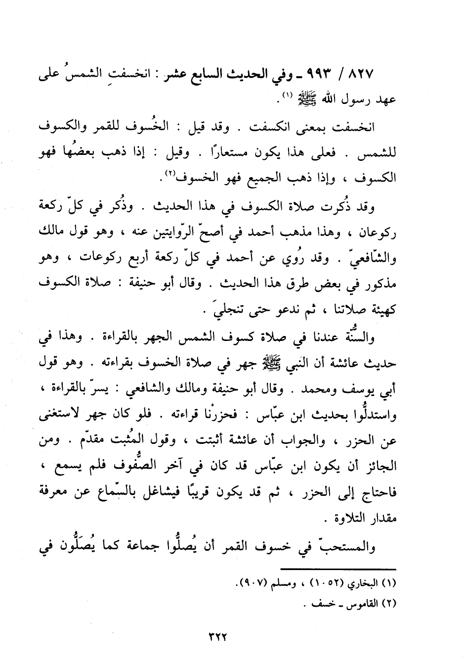 827 - / 993 - وَفِي الحَدِيث السَّابِع عشر: انخسفت الشَّمْس على عهد رَسُول الله صلى الله عَلَيْهِ وَسلم. [15] انخسفت بِمَعْنى انكسفت. وَقد قيل: الخسوف للقمر والكسوف للشمس، فعلى هَذَا يكون مستعارا. وَقيل: إِذا ذهب بَعْضهَا فَهُوَ الْكُسُوف، وَإِذا ذهب الْجَمِيع فَهُوَ الخسوف. [15] وَقد ذكرت صَلَاة الْكُسُوف فِي هَذَا الحَدِيث. وَذكر فِي كل رَكْعَة ركوعان، وَهَذَا مَذْهَب أَحْمد فِي أصح الرِّوَايَتَيْنِ عَنهُ، وَهُوَ قَول مَالك وَالشَّافِعِيّ. وَقد رُوِيَ عَن أَحْمد فِي كل رَكْعَة أَربع ركوعات، وَهُوَ مَذْكُور فِي بعض طرق هَذَا الحَدِيث. وَقَالَ أَبُو حنيفَة: صَلَاة الْكُسُوف كَهَيئَةِ صَلَاتنَا، ثمَّ ندعوا حَتَّى تنجلي. [15] وَالسّنة عندنَا فِي صَلَاة كسوف الشَّمْس الْجَهْر بِالْقِرَاءَةِ. وَهَذَا فِي حَدِيث عَائِشَة أَن النَّبِي صلى الله عَلَيْهِ وَسلم جهر فِي صَلَاة الخسوف بقرَاءَته. وَهُوَ قَول أبي يُوسُف وَمُحَمّد. وَقَالَ أَبُو حنيفَة وَمَالك وَالشَّافِعِيّ: يسر بِالْقِرَاءَةِ، وَاسْتَدَلُّوا بِحَدِيث ابْن عَبَّاس: فحزرنا قِرَاءَته. فَلَو كَانَ جهر لاستغني عَن الحزر، وَالْجَوَاب أَن عَائِشَة أَثْبَتَت، وَقَول الْمُثبت مقدم. وَمن الْجَائِز أَن يكون ابْن عَبَّاس قد كَانَ فِي آخر الصُّفُوف فَلم يسمع، فَاحْتَاجَ إِلَى الحزر، ثمَّ قد يكون قَرِيبا فيشاغل بِالسَّمَاعِ عَن معرفَة مِقْدَار التِّلَاوَة. [15] وَالْمُسْتَحب فِي خُسُوف الْقَمَر أَن يصلوا جمَاعَة كَمَا يصلونَ فِي