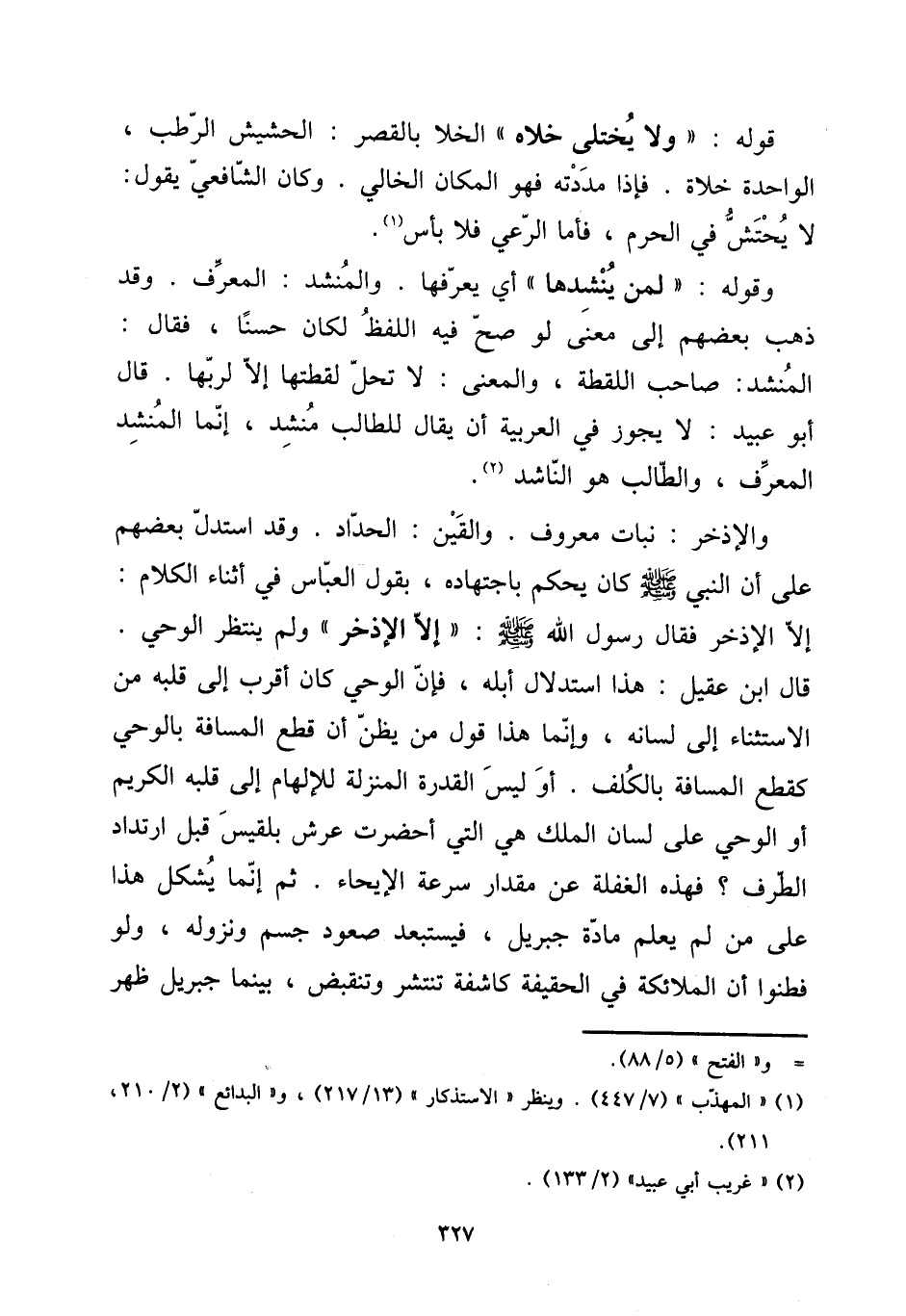 [15] قَوْله: " وَلَا يخْتَلى خلاه " الخلا بِالْقصرِ: الْحَشِيش الرطب، الْوَاحِدَة خلاة. فَإِذا مددته فَهُوَ الْمَكَان الْخَالِي. وَكَانَ الشَّافِعِي يَقُول: لَا يحتش فِي الْحرم، فَأَما الرَّعْي فَلَا بَأْس. [15] وَقَوله: " لمن ينشدها " أَي يعرفهَا. والمنشد: الْمُعَرّف. وَقد ذهب بَعضهم إِلَى معنى لَو صَحَّ فِيهِ اللَّفْظ لَكَانَ حسنا، فَقَالَ: المنشد: صَاحب اللّقطَة، وَالْمعْنَى: لَا تحل لقطتهَا إِلَّا لِرَبِّهَا. قَالَ أَبُو عبيد: لَا يجوز فِي الْعَرَبيَّة أَن يُقَال للطَّالِب منشد، إِنَّمَا المنشد الْمُعَرّف، والطالب هُوَ الناشد. [15] والإذخر: نَبَات مَعْرُوف. والقين: الْحداد. وَقد اسْتدلَّ بَعضهم على أَن النَّبِي صلى الله عَلَيْهِ وَسلم كَانَ يحكم بِاجْتِهَادِهِ، بقول الْعَبَّاس فِي أثْنَاء الْكَلَام: إِلَّا الْإِذْخر فَقَالَ رَسُول الله صلى الله عَلَيْهِ وَسلم: " إِلَّا الْإِذْخر " وَلم ينْتَظر الْوَحْي. قَالَ ابْن عقيل: هَذَا اسْتِدْلَال أبله، فَإِن الْوَحْي كَانَ أقرب إِلَى قلبه من الِاسْتِثْنَاء إِلَى لِسَانه، وَإِنَّمَا هَذَا قَول من يظنّ أَن قطع الْمسَافَة بِالْوَحْي كَقطع الْمسَافَة بالكلف. أَو لَيْسَ الْقُدْرَة الْمنزلَة للإلهام إِلَى قلبه الْكَرِيم أَو الْوَحْي على لِسَان الْملك هِيَ الَّتِي أحضرت عرش بلقيس قبل ارتداد الطّرف؟ فَهَذِهِ الْغَفْلَة عَن مِقْدَار سرعَة الإيحاء. ثمَّ إِنَّمَا يشكل هَذَا على من لم يعلم مَادَّة جِبْرِيل، فيستبعد صعُود جسم ونزوله، وَلَو فطنوا أَن الْمَلَائِكَة فِي الْحَقِيقَة كاشفة تَنْتَشِر وتنقبض، بَيْنَمَا جِبْرِيل ظهر