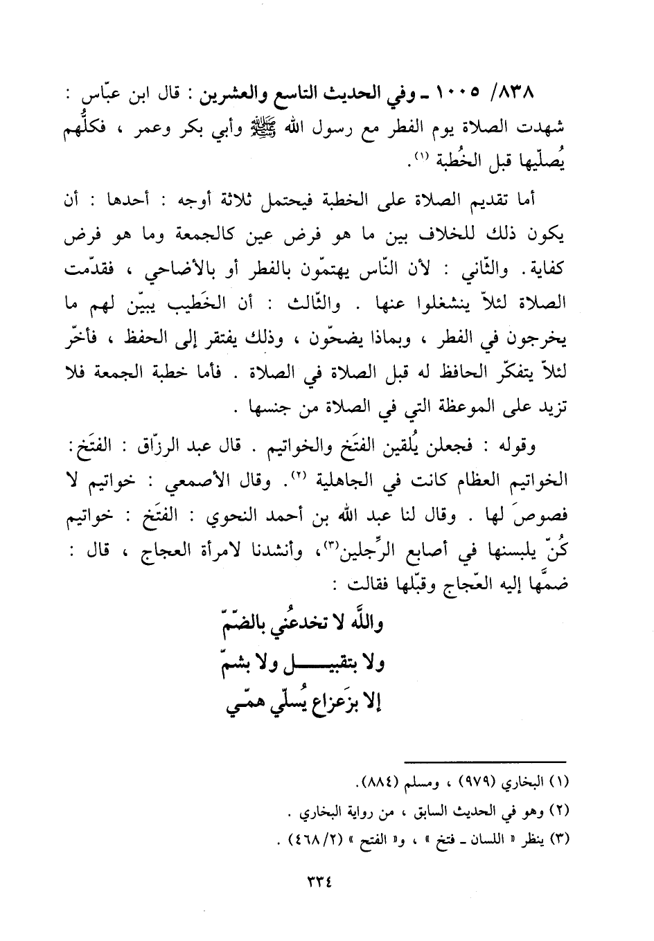 838 - / 1005 - وَفِي الحَدِيث التَّاسِع وَالْعِشْرين: قَالَ ابْن عَبَّاس: شهِدت الصَّلَاة يَوْم الْفطر مَعَ رَسُول الله صلى الله عَلَيْهِ وَسلم وَأبي بكر وَعمر، فكلهم يُصليهَا قبل الْخطْبَة. [15] أما تَقْدِيم الصَّلَاة على الْخطْبَة فَيحْتَمل ثَلَاثَة أوجه: أَحدهَا: أَن يكون ذَلِك للْخلاف بَين مَا هُوَ فرض عين كَالْجُمُعَةِ وَمَا هُوَ فرض كِفَايَة. وَالثَّانِي: لِأَن النَّاس يهتمون بِالْفطرِ أَو بالأضاحي، فَقدمت الصَّلَاة لِئَلَّا ينشغلوا عَنْهَا. وَالثَّالِث: أَن الْخَطِيب يبين لَهُم مَا يخرجُون فِي الْفطر، وبماذا يضحون، وَذَلِكَ يفْتَقر إِلَى الْحِفْظ، فَأخر لِئَلَّا يتفكر الْحَافِظ لَهُ قبل الصَّلَاة فِي الصَّلَاة. فَأَما خطْبَة الْجُمُعَة فَلَا تزيد على الموعظة الَّتِي فِي الصَّلَاة من جِنْسهَا. [15] وَقَوله: فَجعلْنَ يلقين الفتخ وَالْخَوَاتِيم. قَالَ عبد الرَّزَّاق: الفتخ: الخواتيم الْعِظَام كَانَت فِي الْجَاهِلِيَّة. وَقَالَ الْأَصْمَعِي: خَوَاتِيم لَا فصوص لَهَا. وَقَالَ لنا عبد الله بن أَحْمد النَّحْوِيّ: الفتخ: خَوَاتِيم كن يلبسنها فِي أَصَابِع الرجلَيْن، وأنشدنا لامْرَأَة العجاج، قَالَ: ضمهَا إِلَيْهِ العجاج وَقبلهَا فَقَالَت: