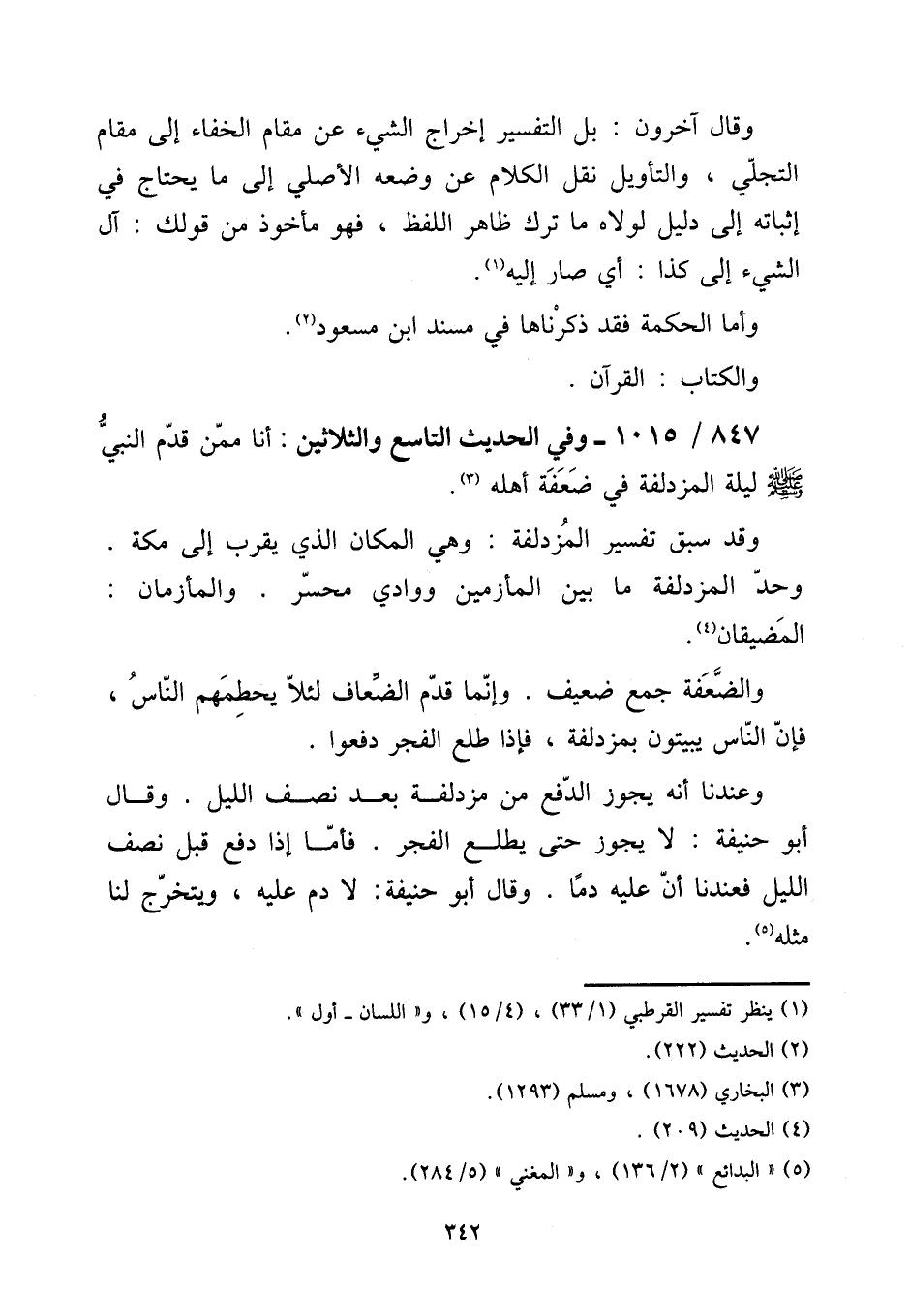 847 - / 1015 - وَفِي الحَدِيث التَّاسِع وَالثَّلَاثِينَ: أَنا مِمَّن قدم النَّبِي صلى الله عَلَيْهِ وَسلم لَيْلَة الْمزْدَلِفَة فِي ضعفة أَهله. [15] وَقد سبق تَفْسِير الْمزْدَلِفَة: وَهِي الْمَكَان الَّذِي يقرب إِلَى مَكَّة. وحد الْمزْدَلِفَة مَا بَين المأزمين ووادي محسر. والمأزمان: المضيقان. [15] والضعفة جمع ضَعِيف. وَإِنَّمَا قدم الضِّعَاف لِئَلَّا يحطمهم النَّاس، فَإِن النَّاس يبيتُونَ بِمُزْدَلِفَة، فَإِذا طلع الْفجْر دفعُوا. [15] وَعِنْدنَا أَنه يجوز الدّفع من مُزْدَلِفَة بعد نصف اللَّيْل. وَقَالَ أَبُو حنيفَة: لَا يجوز حَتَّى يطلع الْفجْر. فَأَما إِذا دفع قبل نصف اللَّيْل فعندنا أَن عَلَيْهِ دَمًا. وَقَالَ أَبُو حنيفَة: لَا دم عَلَيْهِ، وَيتَخَرَّج لنا مثله.
