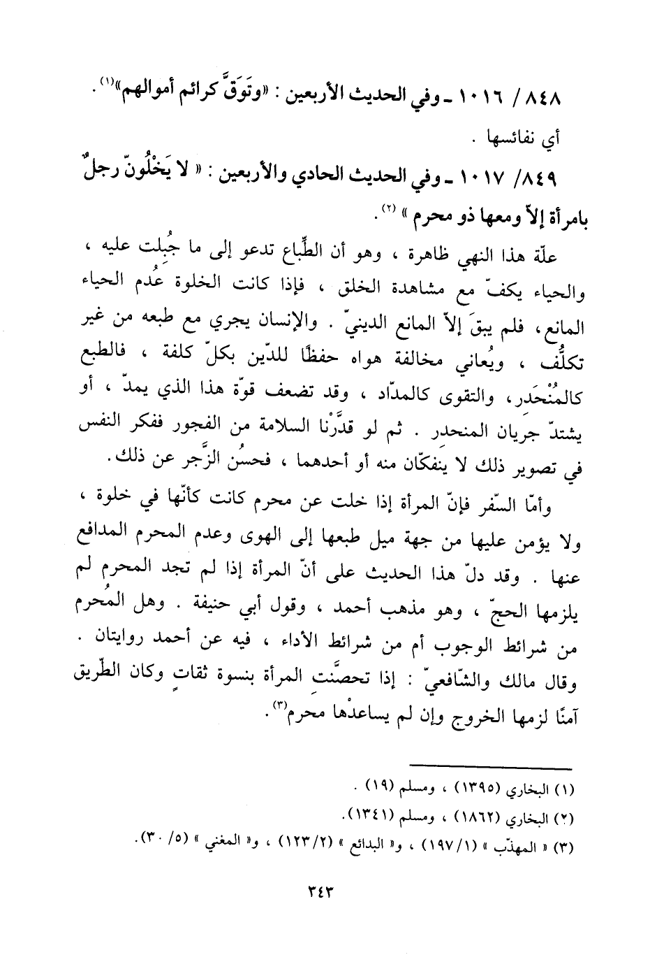 849 - / 1017 - وَفِي الحَدِيث الْحَادِي وَالْأَرْبَعِينَ: " لَا يخلون رجل بِامْرَأَة إِلَّا وَمَعَهَا ذُو محرم. [15] عِلّة هَذَا النَّهْي ظَاهِرَة، وَهُوَ أَن الطباع تَدْعُو إِلَى مَا جبلت عَلَيْهِ، وَالْحيَاء يكف مَعَ مُشَاهدَة الْخلق، فَإِذا كَانَت الْخلْوَة عدم الْحيَاء الْمَانِع، فَلم يبْق إِلَّا الْمَانِع الديني. وَالْإِنْسَان يجْرِي مَعَ طبعه من غير تكلّف، ويعاني مُخَالفَة هَوَاهُ حفظا للدّين بِكُل كلفة، فالطبع كالمنحدر، وَالتَّقوى كالمداد، وَقد تضعف قُوَّة هَذَا الَّذِي يمد، أَو يشْتَد جَرَيَان المنحدر. ثمَّ لَو قَدرنَا السَّلامَة من الْفُجُور ففكر النَّفس فِي تَصْوِير ذَلِك لَا ينفكان مِنْهُ أَو أَحدهمَا، فَحسن الزّجر عَن ذَلِك. [15] وَأما السّفر فَإِن الْمَرْأَة إِذا خلت عَن محرم كَانَت كَأَنَّهَا فِي خلْوَة، وَلَا يُؤمن عَلَيْهَا من جِهَة ميل طبعها إِلَى الْهوى وَعدم الْمحرم المدافع عَنْهَا. وَقد دلّ هَذَا الحَدِيث على أَن الْمَرْأَة إِذا لم تَجِد الْمحرم لم يلْزمهَا الْحَج، وَهُوَ مَذْهَب أَحْمد، وَقَول أبي حنيفَة. وَهل الْمحرم من شَرَائِط الْوُجُوب أم من شَرَائِط الْأَدَاء، فِيهِ عَن أَحْمد رِوَايَتَانِ. وَقَالَ مَالك وَالشَّافِعِيّ: إِذا تحصنت الْمَرْأَة بنسوة ثِقَات وَكَانَ الطَّرِيق آمنا لَزِمَهَا الْخُرُوج وَإِن لم يساعدها محرم.