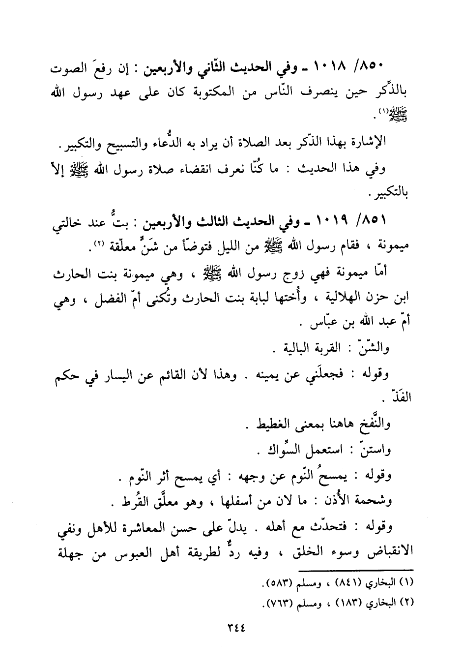 851 - / 1091 وَفِي الحَدِيث الثَّالِث وَالْأَرْبَعِينَ: بت عِنْد خَالَتِي مَيْمُونَة، فَقَامَ رَسُول الله صلى الله عَلَيْهِ وَسلم من اللَّيْل فَتَوَضَّأ من شن معلقَة. [15] أما مَيْمُونَة فَهِيَ زوج رَسُول الله صلى الله عَلَيْهِ وَسلم، وَهِي مَيْمُونَة بنت الْحَارِث ابْن حزن الْهِلَالِيَّة، وَأُخْتهَا لبَابَة بنت الْحَارِث وتكنى أم الْفضل، وَهِي أم عبد الله بن عَبَّاس. [15] والشن: الْقرْبَة البالية. [15] وَقَوله: فجعلني عَن يَمِينه. وَهَذَا لِأَن الْقَائِم عَن الْيَسَار فِي حكم الْفَذ. [15] والنفخ هَاهُنَا بِمَعْنى الغطيط. [15] واستن: اسْتعْمل السِّوَاك. [15] وَقَوله: يمسح النّوم عَن وَجهه: أَي يمسح أثر النّوم. [15] وشحمة الْأذن: مَا لَان من أَسْفَلهَا، وَهُوَ مُعَلّق القرط. [15] وَقَوله: فَتحدث مَعَ أَهله. يدل على حسن المعاشرة للأهل وَنفي الانقباض وَسُوء الْخلق، وَفِيه رد لطريقة أهل العبوس من جهلة