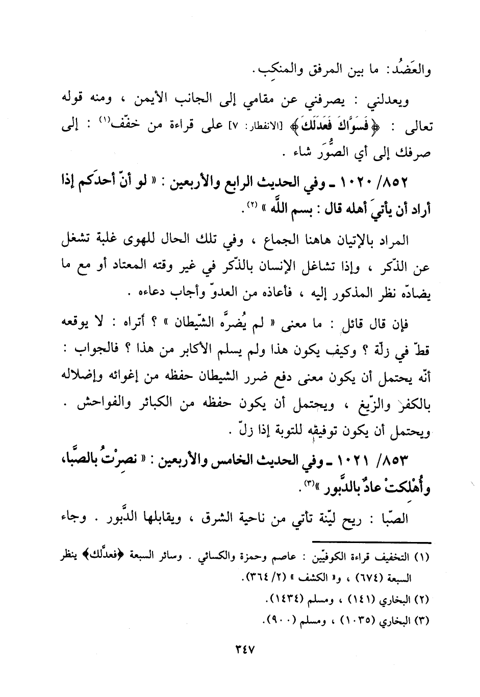 852 - / 1020 - وَفِي الحَدِيث الرَّابِع وَالْأَرْبَعِينَ: " لَو أَن أحدكُم إِذا أَرَادَ أَن يَأْتِي أَهله قَالَ: بِسم الله ". [15] المُرَاد بالإتيان هَاهُنَا الْجِمَاع، وَفِي تِلْكَ الْحَال للهوى غَلَبَة تشغل عَن الذّكر، وَإِذا تشاغل الْإِنْسَان بِالذكر فِي غير وقته الْمُعْتَاد أَو مَعَ مَا يضاده نظر الْمَذْكُور إِلَيْهِ، فأعاذه من الْعَدو وَأجَاب دعاءه. [15] فَإِن قَالَ قَائِل: مَا معنى " لم يضرّهُ الشَّيْطَان "؟ أتراه: لَا يوقعه قطّ فِي زلَّة؟ وَكَيف يكون هَذَا وَلم يسلم الأكابر من هَذَا؟ فَالْجَوَاب: أَنه يحْتَمل أَن يكون معنى دفع ضَرَر الشَّيْطَان حفظه من إغوائه وإضلاله بالْكفْر والزيغ، وَيحْتَمل أَن يكون حفظه من الْكَبَائِر وَالْفَوَاحِش. وَيحْتَمل أَن يكون توفيقه للتَّوْبَة إِذا زل.