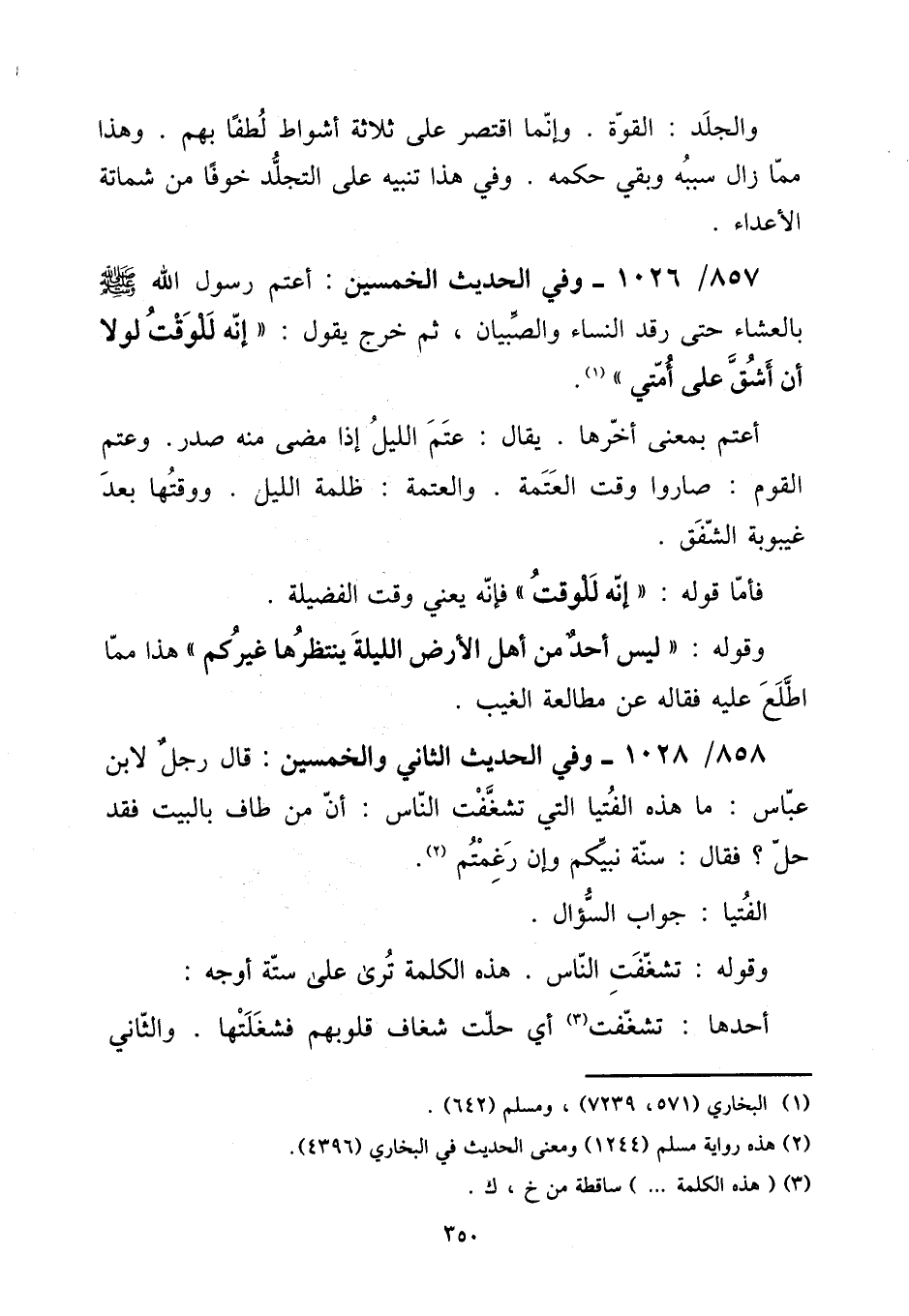 857 - / 1026 - وَفِي الحَدِيث الْخمسين: أعتم رَسُول الله صلى الله عَلَيْهِ وَسلم بالعشاء حَتَّى رقد النِّسَاء وَالصبيان، ثمَّ خرج يَقُول: " أَنه للْوَقْت لَوْلَا أَن أشق على أمتِي ". [15] أعتم بِمَعْنى أَخّرهَا. يُقَال: عتم اللَّيْل إِذا مضى مِنْهُ صدر. وعتم الْقَوْم: صَارُوا وَقت الْعَتَمَة. وَالْعَتَمَة: ظلمَة اللَّيْل. ووقتها بعد غيبوبة الشَّفق. [15] فَأَما قَوْله: " إِنَّه للْوَقْت " فَإِنَّهُ يَعْنِي وَقت الْفَضِيلَة ". [15] وَقَوله: " لَيْسَ أحد من أهل الأَرْض اللَّيْلَة ينتظرها غَيْركُمْ " هَذَا مِمَّا اطلع عَلَيْهِ فقاله عَن مطالعة الْغَيْب.
