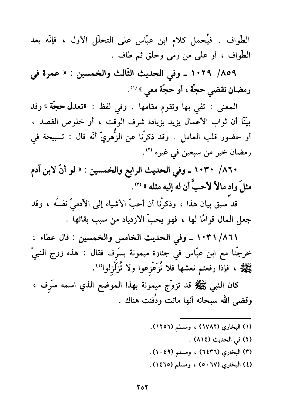 861 - / 1031 - وَفِي الحَدِيث الْخَامِس وَالْخمسين: قَالَ عَطاء: خرجنَا مَعَ ابْن عَبَّاس فِي جَنَازَة مَيْمُونَة بسرف فَقَالَ: هَذِه زوج النَّبِي صلى الله عَلَيْهِ وَسلم، فَإِذا رفعتم نعشها فَلَا تزعزعوا وَلَا تزلزلوا. [15] كَانَ النَّبِي صلى الله عَلَيْهِ وَسلم قد تزوج مَيْمُونَة بِهَذَا الْموضع الَّذِي اسْمه سرف، وَقضى الله سُبْحَانَهُ أَنَّهَا مَاتَت ودفنت هُنَاكَ.