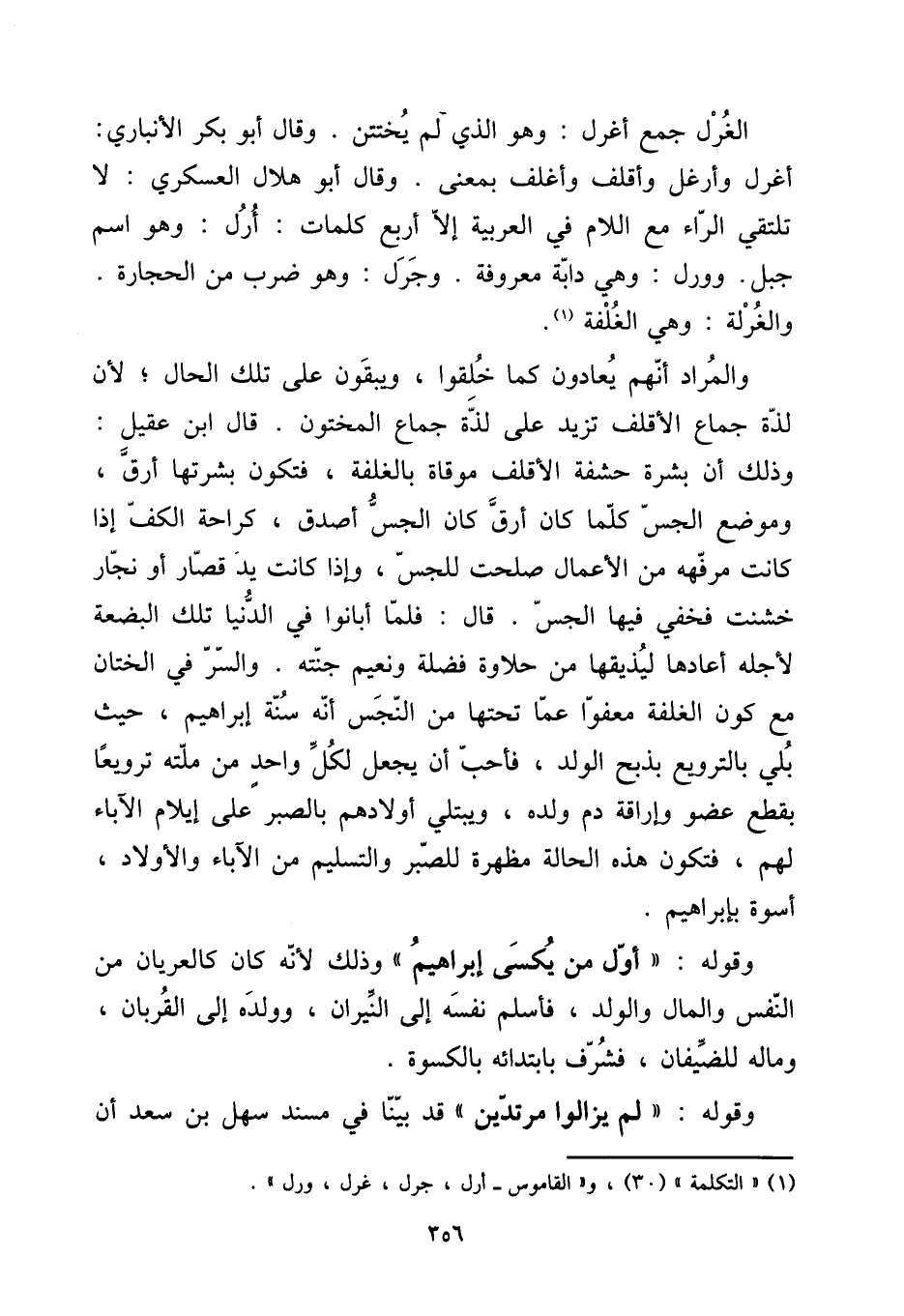 [15] الغرل: جمع أغرل: وَهُوَ الَّذِي لم يختتن. وَقَالَ أَبُو بكر الْأَنْبَارِي: أغرل وأرغل وأقلف وأغلف بِمَعْنى. وَقَالَ أَبُو هِلَال العسكري: لَا تلتقي الرَّاء مَعَ اللَّام فِي الْعَرَبيَّة إِلَّا أَربع كَلِمَات: أرل: وَهُوَ اسْم جبل وورل: وَهِي دَابَّة مَعْرُوفَة. وجرل: وَهُوَ ضرب من الْحِجَارَة. والغرلة: وَهِي الغلفة. [15] وَالْمرَاد أَنهم يعادون كَمَا خلقُوا، ويبقون على تِلْكَ الْحَال؛ لِأَن لَذَّة جماع الأقلف تزيد على لَذَّة جماع المختون. قَالَ ابْن عقيل: وَذَلِكَ أَن بشرة حَشَفَة الأقلف موقاة بالغلفة، فَتكون بَشرَتهَا أرق، وَمَوْضِع الجس كلما كَانَ أرق كَانَ الجس أصدق، كراحة الْكَفّ إِذا كَانَت مرفهة من الْأَعْمَال صلحت للجس، وَإِذا كَانَت يَد قصار أَو نجار خشنت فخفي فِيهَا الجس. قَالَ: فَلَمَّا أبانوا فِي الدُّنْيَا تِلْكَ الْبضْعَة لأَجله أَعَادَهَا ليذيقها من حلاوة فضلَة ونعيم جنته. والسر فِي الْخِتَان مَعَ كَون الغلفة معفوا عَمَّا تحتهَا من النَّجس أَنه سنة إِبْرَاهِيم، حَيْثُ بلي بالترويع بِذبح الْوَلَد، فَأحب أَن يَجْعَل لكل وَاحِد من مِلَّته ترويعا بِقطع عُضْو وإراقة دم وَلَده، ويبتلي أَوْلَادهم بِالصبرِ على إيلام الْآبَاء لَهُم، فَتكون هَذِه الْحَالة مظهرة للصبر وَالتَّسْلِيم من الْآبَاء وَالْأَوْلَاد، أُسْوَة بإبراهيم. [15] وَقَوله: " أول من يكسى إِبْرَاهِيم " وَذَلِكَ لِأَنَّهُ كَانَ كالعريان من النَّفس وَالْمَال وَالْولد، فَأسلم نَفسه إِلَى النيرَان، وَولده إِلَى القربان، وَمَاله للضيفان، فشرف بابتدائه بالكسوة. [15] وَقَوله: " لم يزَالُوا مرتدين " قد بَينا فِي مُسْند سهل بن سعد أَن