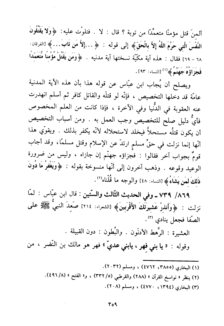 أَلِمَنْ قتل مُؤمنا مُتَعَمدا من تَوْبَة؟ قَالَ: لَا. فتلوت عَلَيْهِ: {وَلَا يقتلُون النَّفس الَّتِي حرم الله إِلَّا بِالْحَقِّ} إِلَى قَوْله: {إِلَّا من تَابَ} [الْفرْقَان: 68 - 69] فَقَالَ: هَذِه آيَة مَكِّيَّة نسختها آيَة مَدَنِيَّة. {وَمن يقتل مُؤمنا مُتَعَمدا فَجَزَاؤُهُ جَهَنَّم} [النِّسَاء: 93] . [15] وَيصْلح أَن يُجَاب ابْن عَبَّاس عَن قَوْله هَذَا بِأَن هَذِه الْآيَة المدنية عَامَّة قد دَخلهَا التَّخْصِيص، فَإِنَّهُ لَو قَتله وَالْقَاتِل كَافِر ثمَّ أسلم انهدرت عَنهُ الْعقُوبَة فِي الدُّنْيَا وَفِي الْآخِرَة، فَإِذا كَانَت من الْعلم الْمَخْصُوص فَأَي دَلِيل صلح للتخصيص وَجب الْعَمَل بِهِ. وَمن أَسبَاب التَّخْصِيص أَن يكون قَتله مستحلا فيخلد لَا ستحلاله لِأَنَّهُ يكفر بذلك. وَيُقَوِّي هَذَا أَنَّهَا إِنَّمَا نزلت فِي حق مُسلم ارْتَدَّ عَن الْإِسْلَام وَقتل مُسلما، وَقد أجَاب قوم بِجَوَاب آخر فَقَالُوا: فَجَزَاؤُهُ جَهَنَّم إِن جازاه، وَلَيْسَ من ضَرُورَة الْوَعيد وُقُوعه. وَذهب آخَرُونَ إِلَى أَنَّهَا مَنْسُوخَة بقوله: {وَيغْفر مَا دون ذَلِك لمن يَشَاء} [النِّسَاء: 48] وَالْوَجْه مَا قُلْنَاهُ.
