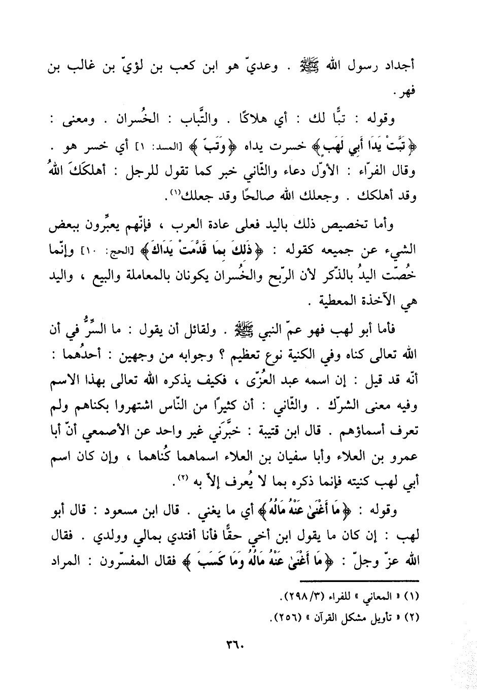أجداد رَسُول الله صلى الله عَلَيْهِ وَسلم. وعدي هُوَ ابْن كَعْب بن لؤَي بن غَالب بن فهر. [15] وَقَوله: تَبًّا لَك: أَي هَلَاكًا. والتباب: الخسران. وَمعنى: {تبت يدا أبي لَهب} خسرت يَدَاهُ {وَتب} [المسد: 1] أَي خسر هُوَ. وَقَالَ الْفراء: الأول دُعَاء وَالثَّانِي خبر كَمَا تَقول للرجل: أهْلكك الله وَقد أهْلكك. وجعلك الله صَالحا وَقد جعلك. [15] وَأما تَخْصِيص ذَلِك بِالْيَدِ فعلى عَادَة الْعَرَب، فَإِنَّهُم يعبرون بِبَعْض الشَّيْء عَن جَمِيعه كَقَوْلِه: {ذَلِك بِمَا قدمت يداك} [الْحَج: 10] وَإِنَّمَا خصت الْيَد بِالذكر لِأَن الرِّبْح والخسران يكونَانِ بالمعاملة وَالْبيع، وَالْيَد هِيَ الآخذة المعطية. [15] فَأَما أَبُو لَهب فَهُوَ عَم النَّبِي صلى الله عَلَيْهِ وَسلم. وَلقَائِل أَن يَقُول: مَا السِّرّ فِي أَن الله تَعَالَى كناه وَفِي الكنية نوع تَعْظِيم؟ وَجَوَابه من وَجْهَيْن: أَحدهمَا: أَنه قد قيل: إِن اسْمه عبد الْعُزَّى، فَكيف يذكرهُ الله تَعَالَى بِهَذَا الِاسْم وَفِيه معنى الشّرك. وَالثَّانِي: أَن كثيرا من النَّاس اشتهروا بكناهم وَلم تعرف أَسمَاؤُهُم. قَالَ ابْن قُتَيْبَة: خبرني غير وَاحِد عَن الْأَصْمَعِي أَن أَبَا عَمْرو بن الْعَلَاء وَأَبا سُفْيَان بن الْعَلَاء اسماهما كناهما، وَإِن كَانَ اسْم أبي لَهب كنيته فَإِنَّمَا ذكره بِمَا لَا يعرف إِلَّا بِهِ. [15] وَقَوله: {مَا أغْنى عَنهُ مَاله} أَي مَا يُغني. قَالَ ابْن مَسْعُود: قَالَ أَبُو لَهب: إِن كَانَ مَا يَقُول ابْن أخي حَقًا فَأَنا أفتدي بِمَالي وَوَلَدي. فَقَالَ الله عز وَجل: {مَا أغْنى عَنهُ مَاله وَمَا كسب} فَقَالَ الْمُفَسِّرُونَ: المُرَاد