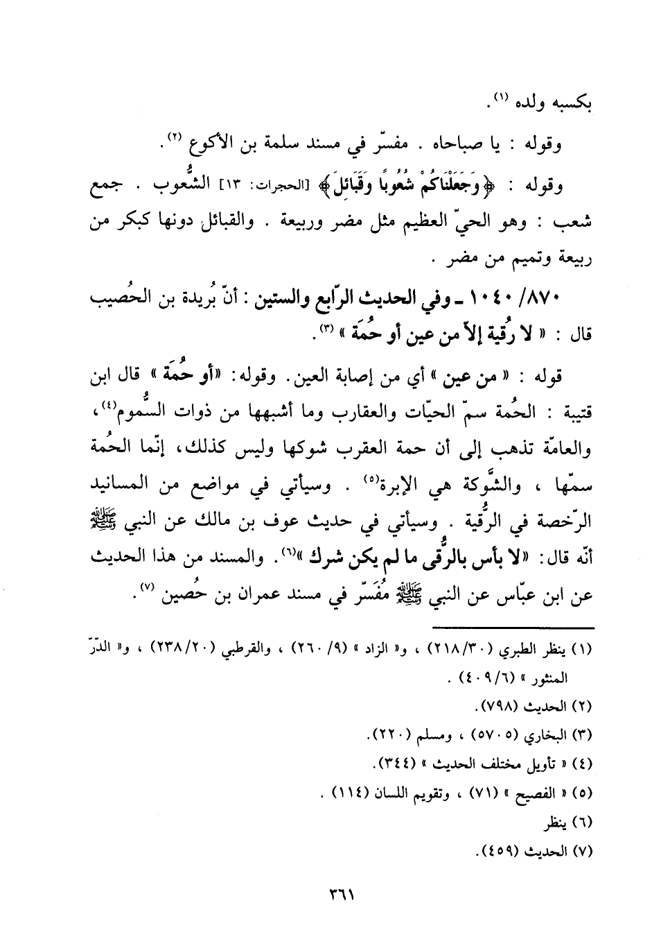 870 - / 1040 وَفِي الحَدِيث الرَّابِع وَالسِّتِّينَ: أَن بُرَيْدَة بن الْحصيب قَالَ: " لَا رقية إِلَّا من عين أَو حمة ". [15] قَوْله: " من عين " أَي من إِصَابَة الْعين. وَقَوله: " أَو حمة " قَالَ ابْن قُتَيْبَة: الْحمة سم الْحَيَّات والعقارب وَمَا أشبههَا من ذَوَات السمُوم، والعامة تذْهب إِلَى أَن حمة الْعَقْرَب شَوْكهَا وَلَيْسَ كَذَلِك، إِنَّمَا الْحمة سمها، والشوكة هِيَ الإبرة. وَسَيَأْتِي فِي مَوَاضِع من المسانيد الرُّخْصَة فِي الرّقية. وَسَيَأْتِي فِي حَدِيث عَوْف بن مَالك عَن النَّبِي صلى الله عَلَيْهِ وَسلم أَنه قَالَ: " لَا بَأْس بالرقى مَا لم يكن شرك ". والمسند من هَذَا الحَدِيث عَن ابْن عَبَّاس عَن النَّبِي صلى الله عَلَيْهِ وَسلم مُفَسّر فِي مُسْند عمرَان بن حُصَيْن.