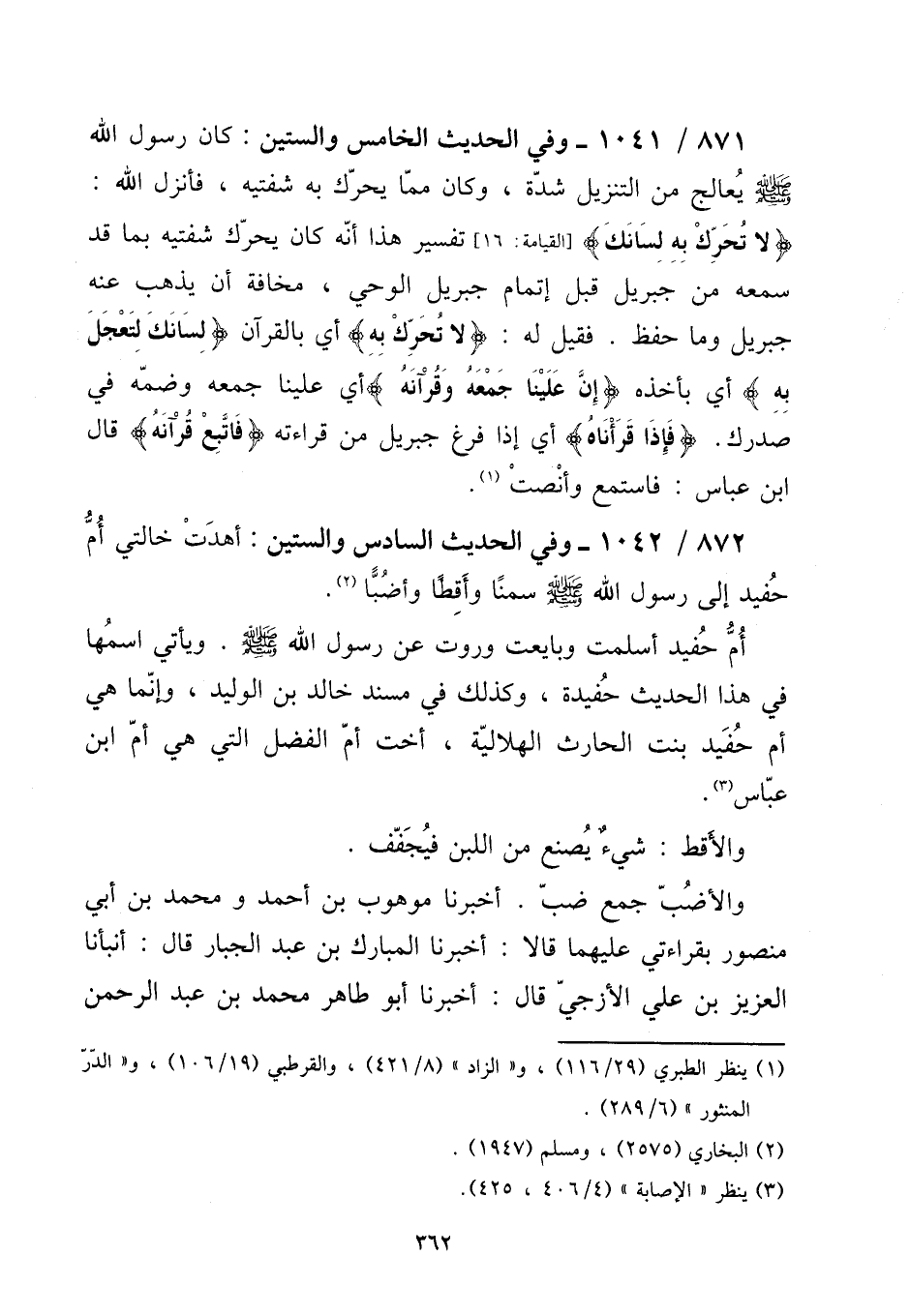 872 - / 1042 - وَفِي الحَدِيث السَّادِس وَالسِّتِّينَ: أَهْدَت خَالَتِي أم حفيد إِلَى رَسُول الله صلى الله عَلَيْهِ وَسلم سمنا وَأَقِطًا وأضبا. [15] أم حفيد أسلمت وبايعت وروت عَن رَسُول الله صلى الله عَلَيْهِ وَسلم. وَيَأْتِي اسْمهَا فِي هَذَا الحَدِيث حفيدة، وَكَذَلِكَ فِي مُسْند خَالِد بن الْوَلِيد، وَإِنَّمَا هِيَ أم حفيد بنت الْحَارِث الْهِلَالِيَّة، أُخْت أم الْفضل الَّتِي هِيَ أم ابْن عَبَّاس. [15] والأقط: شَيْء يصنع من اللَّبن فيجفف. [15] والأضب جمع ضَب. أخبرنَا موهوب بن أَحْمد وَمُحَمّد بن أبي مَنْصُور بِقِرَاءَتِي عَلَيْهِمَا قَالَا: أخبرنَا الْمُبَارك بن عبد الْجَبَّار قَالَ: أَنبأَنَا الْعَزِيز بن عَليّ الْأَزجيّ قَالَ: أخبرنَا أَبُو طَاهِر مُحَمَّد بن عبد الرَّحْمَن