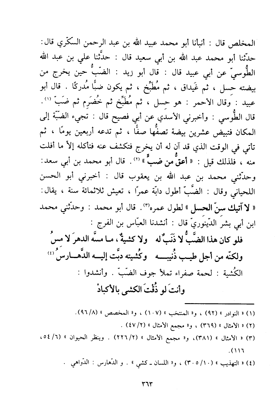 المخلص قَالَ: أَنبأَنَا أَبُو مُحَمَّد عبيد الله بن عبد الرَّحْمَن السكرِي قَالَ: حَدثنَا أَبُو مُحَمَّد عبد الله بن أبي سعيد قَالَ: حَدثنَا عَليّ بن عبد الله الطوسي عَن أبي عبيد قَالَ: قَالَ أَبُو زيد: الضَّب حِين يخرج من بيضته حسل، ثمَّ غيداق، ثمَّ مطبخ، ثمَّ يكون ضباً مدْركا. قَالَ أَبُو عبيد: وَقَالَ الْأَحْمَر: هُوَ حسل، ثمَّ مطبخ ثمَّ خضرم ثمَّ ضَب. قَالَ الطوسي: وَأَخْبرنِي الْأَسدي عَن أبي فصيح قَالَ: تَجِيء الضبة إِلَى الْمَكَان فتبيض عشْرين بَيْضَة تصفها صفا، ثمَّ تَدعه أَرْبَعِينَ يَوْمًا، ثمَّ تَأتي فِي الْوَقْت الَّذِي قد آن لَهُ أَن يخرج فتكشف عَنهُ فتأكله إِلَّا مَا أفلت مِنْهُ، فَلذَلِك قيل: " أعق من ضَب ". قَالَ أَبُو مُحَمَّد بن أبي سعد: وحَدثني مُحَمَّد بن عبد الله بن يَعْقُوب قَالَ: أَخْبرنِي أَبُو الْحسن اللحياني وَقَالَ: الضَّب أطول دَابَّة عمرا، تعيش ثَلَاثمِائَة سنة، يُقَال: " لَا آتِيك سنّ الحسل " لطول عمره. قَالَ أَبُو مُحَمَّد: وحَدثني مُحَمَّد ابْن أبي بشر الدينَوَرِي قَالَ: أنشدنا الْعَبَّاس بن الْفرج: