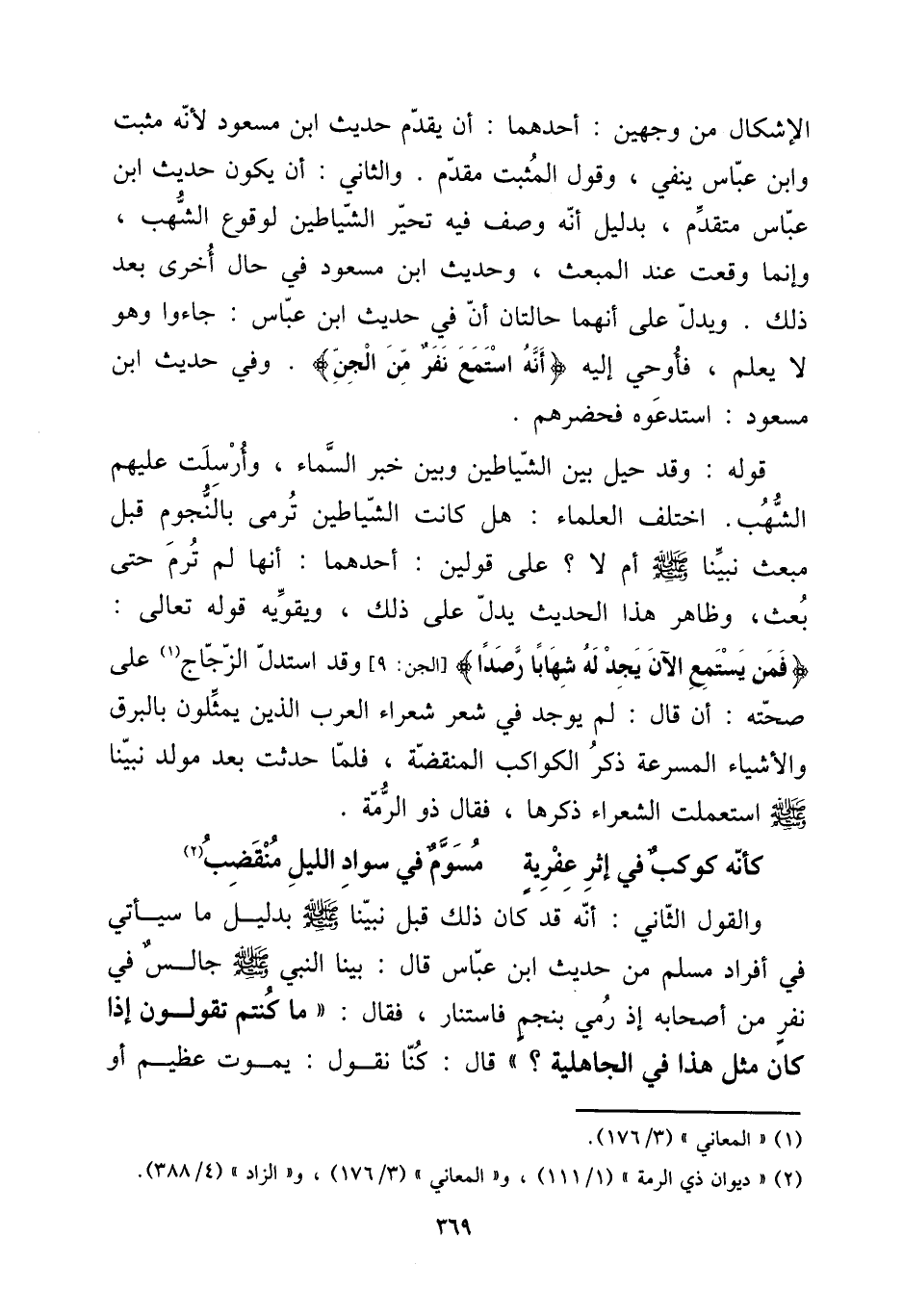 الْإِشْكَال من وَجْهَيْن: أَحدهمَا: أَن يقدم حَدِيث ابْن مَسْعُود لِأَنَّهُ مُثبت وَابْن عَبَّاس يَنْفِي، وَقَول الْمُثبت مقدم. وَالثَّانِي: أَن يكون حَدِيث ابْن عَبَّاس مُتَقَدم، بِدَلِيل أَنه وصف فِيهِ تحير الشَّيَاطِين لوُقُوع الشهب، وَإِنَّمَا وَقعت عِنْد المبعث، وَحَدِيث ابْن مَسْعُود فِي حَال أُخْرَى بعد ذَلِك. وَيدل على أَنَّهُمَا حالتان أَن فِي حَدِيث ابْن عَبَّاس: جَاءُوا وَهُوَ لَا يعلم، فَأُوحي إِلَيْهِ {أَنه اسْتمع نفر من الْجِنّ} . وَفِي حَدِيث ابْن مَسْعُود: استدعوه فحضرهم. [15] قَوْله: وَقد حيل بَين الشَّيَاطِين وَبَين خبر السَّمَاء، وَأرْسلت عَلَيْهِم الشهب. اخْتلف الْعلمَاء: هَل كَانَت الشَّيَاطِين ترمى بالنجوم قبل مبعث نَبينَا صلى الله عَلَيْهِ وَسلم أم لَا؟ على قَوْلَيْنِ: أَحدهمَا: أَنَّهَا لم ترم حَتَّى بعث، وَظَاهر هَذَا الحَدِيث يدل على ذَلِك، ويقويه قَوْله تَعَالَى: {فَمن يستمع الْآن يجد لَهُ شهابا رصدا} [الْجِنّ: 19] وَقد اسْتدلَّ الزّجاج على صِحَّته: أَن قَالَ: لم يُوجد فِي شعر شعراء الْعَرَب الَّذين يمثلون بالبرق والأشياء المسرعة ذكر الْكَوَاكِب المنقضة، فَلَمَّا حدثت بعد مولد نَبينَا صلى الله عَلَيْهِ وَسلم اسْتعْملت الشُّعَرَاء ذكرهَا، فَقَالَ ذُو الرمة.