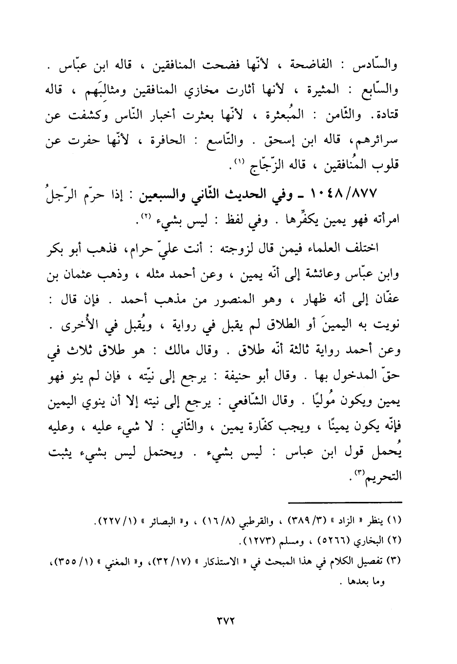 877 - / 1048 - وَفِي الحَدِيث الثَّانِي وَالسبْعين: إِذا حرم الرجل امْرَأَته فَهُوَ يَمِين يكفرهَا. وَفِي لفظ: لَيْسَ بِشَيْء. [15] اخْتلف الْعلمَاء فِيمَن قَالَ لزوجته: أَنْت عَليّ حرَام، فَذهب أَبُو بكر وَابْن عَبَّاس وَعَائِشَة إِلَى أَنه يَمِين، وَعَن أَحْمد مثله، وَذهب عُثْمَان بن عَفَّان إِلَى أَنه ظِهَار، وَهُوَ الْمَنْصُور من مَذْهَب أَحْمد. فَإِن قَالَ: نَوَيْت بِهِ الْيَمين أَو الطَّلَاق لم يقبل فِي رِوَايَة، وَيقبل فِي الْأُخْرَى. وَعَن أَحْمد رِوَايَة ثَالِثَة أَنه طَلَاق. وَقَالَ مَالك: هُوَ طَلَاق ثَلَاث فِي حق الْمَدْخُول بهَا. وَقَالَ أَبُو حنيفَة: يرجع إِلَى نِيَّته، فَإِن لم ينْو فَهُوَ يَمِين وَيكون موليا. وَقَالَ الشَّافِعِي: يرجع إِلَى نِيَّته إِلَّا أَن يَنْوِي الْيَمين فَإِنَّهُ يكون يَمِينا، وَيجب كَفَّارَة يَمِين، وَالثَّانِي: لَا شَيْء عَلَيْهِ، وَعَلِيهِ يحمل قَول ابْن عَبَّاس: لَيْسَ بِشَيْء. وَيحْتَمل لَيْسَ بِشَيْء يثبت التَّحْرِيم.