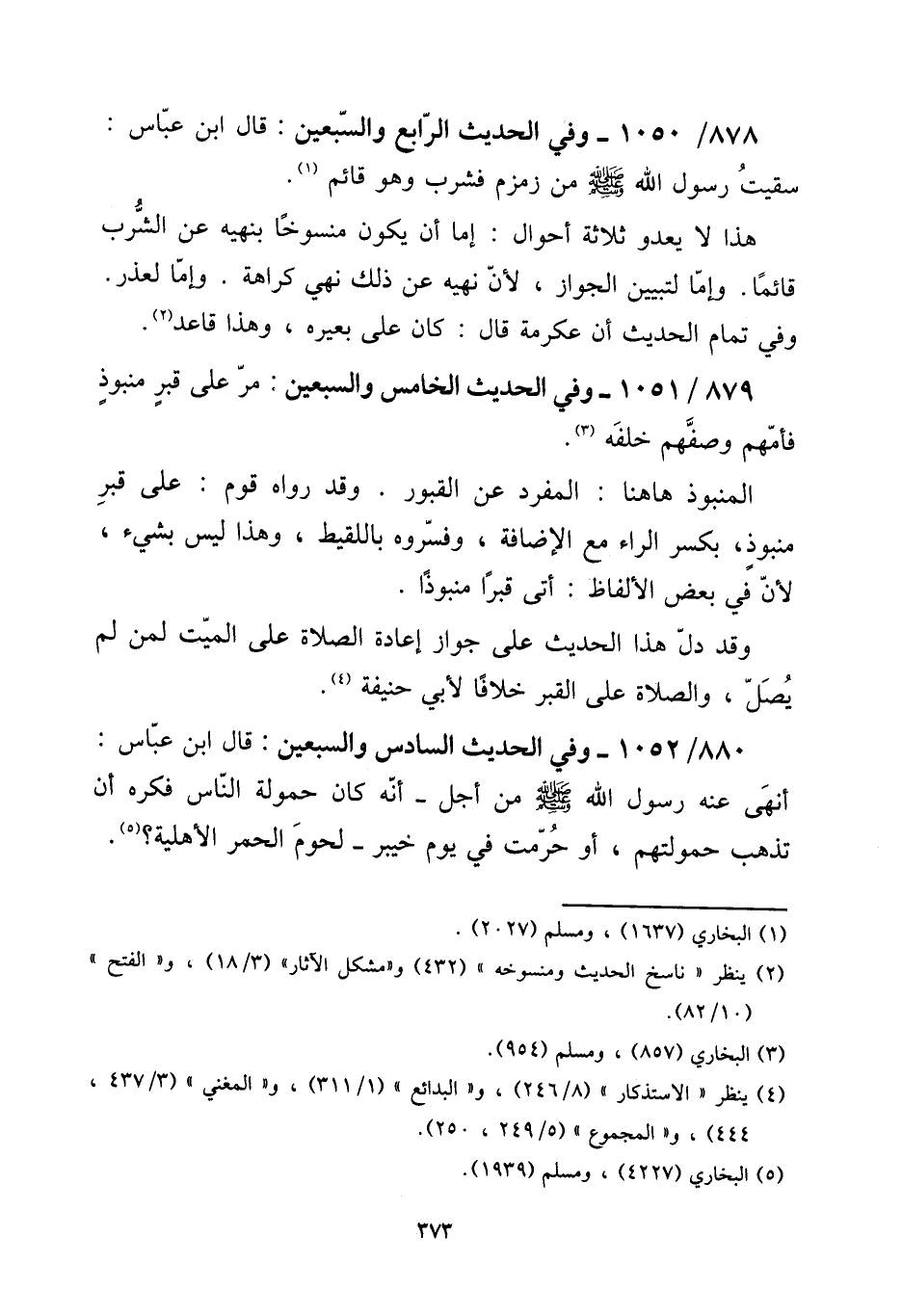 880 - / 1052 - وَفِي الحَدِيث السَّادِس وَالسبْعين: قَالَ ابْن عَبَّاس: أنهى عَنهُ رَسُول الله صلى الله عَلَيْهِ وَسلم من أجل - أَنه كَانَ حمولة النَّاس فكره أَن تذْهب حمولتهم، أَو حرمت فِي يَوْم خَيْبَر - لُحُوم الْحمر الْأَهْلِيَّة؟ .