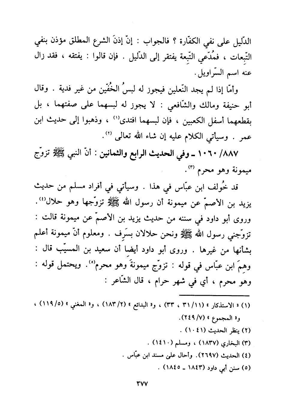 887 - / 1060 وَفِي الحَدِيث الرَّابِع والثمانين: أَن النَّبِي صلى الله عَلَيْهِ وَسلم تزوج مَيْمُونَة وَهُوَ محرم. [15] قد خُولِفَ ابْن عَبَّاس فِي هَذَا. وَسَيَأْتِي فِي أَفْرَاد مُسلم من حَدِيث يزِيد بن الْأَصَم عَن مَيْمُونَة أَن رَسُول الله صلى الله عَلَيْهِ وَسلم تزَوجهَا وَهُوَ حَلَال. وروى أَبُو دَاوُد فِي سنَنه من حَدِيث يزِيد بن الْأَصَم عَن مَيْمُونَة قَالَت: تزَوجنِي رَسُول الله صلى الله عَلَيْهِ وَسلم وَنحن حلالان بسرف. وَمَعْلُوم أَن مَيْمُونَة أعلم بشأنها من غَيرهَا. وروى أَبُو دَاوُد أَيْضا أَن سعيد بن الْمسيب قَالَ: وهم ابْن عَبَّاس فِي قَوْله: تزوج مَيْمُونَة وَهُوَ محرم. وَيحْتَمل قَوْله: وَهُوَ محرم، أَي فِي شهر حرَام، قَالَ الشَّاعِر: