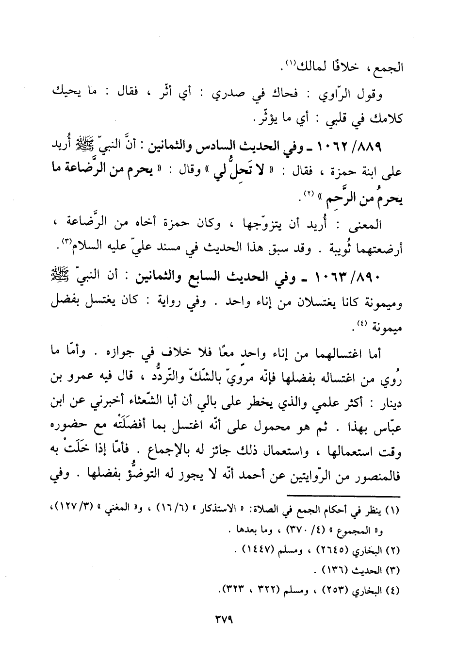 890 - / 1063 - وَفِي الحَدِيث السَّابِع والثمانين: أَن النَّبِي صلى الله عَلَيْهِ وَسلم ومَيْمُونَة كَانَا يغتسلان من إِنَاء وَاحِد. وَفِي رِوَايَة كَانَ يغْتَسل بِفضل مَيْمُونَة. [15] أما اغتسالهما من إِنَاء وَاحِد مَعًا فَلَا خلاف فِي جَوَازه. وَأما مَا رُوِيَ من اغتساله بفضلها فَإِنَّهُ مَرْوِيّ بِالشَّكِّ والتردد، قَالَ فِيهِ عَمْرو بن دِينَار: أَكثر علمي وَالَّذِي يخْطر على بالي أَن أَبَا الشعْثَاء أَخْبرنِي عَن ابْن عَبَّاس بِهَذَا. ثمَّ هُوَ مَحْمُول على أَنه اغْتسل بِمَا أفضلته مَعَ حُضُوره وَقت اسْتِعْمَالهَا، وَاسْتِعْمَال ذَلِك جَائِز لَهُ بِالْإِجْمَاع. فَأَما إِذا خلت بِهِ فالمنصور من الرِّوَايَتَيْنِ عَن أَحْمد أَنه لَا يجوز لَهُ التَّوَضُّؤ بفضلها. وَفِي