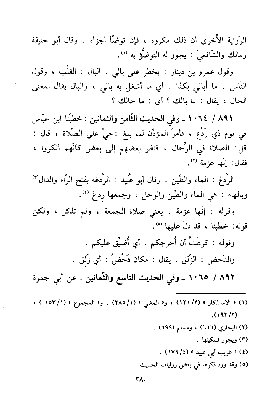 891 - / 1064 - وَفِي الحَدِيث الثَّامِن والثمانين: خَطَبنَا ابْن عَبَّاس فِي يَوْم ذِي ردغ، فَأمر الْمُؤَذّن لما بلغ: حَيّ على الصَّلَاة، قَالَ: قل: الصَّلَاة فِي الرّحال، فَنظر بَعضهم إِلَى بعض كَأَنَّهُمْ أَنْكَرُوا، فَقَالَ: إِنَّهَا عَزمَة. [15] الردغ: المَاء والطين. وَقَالَ أَبُو عبيد: الردغة بِفَتْح الرَّاء وَالدَّال وبالهاء: هِيَ المَاء والطين والوحل، وَجَمعهَا رداغ. [15] وَقَوله: إِنَّهَا عَزمَة. يَعْنِي صَلَاة الْجُمُعَة، وَلم تذكر، وَلَكِن قَوْله خَطَبنَا، قد دلّ عَلَيْهَا. [15] وَقَوله: كرهت أَن أحرجكم. أَي أضيق عَلَيْكُم. [15] والدحض: الزلق. يُقَال: مَكَان دحض: أَي زلق.