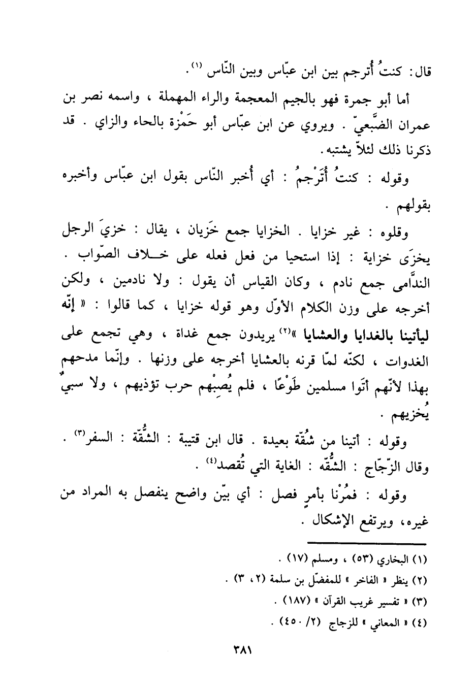 قَالَ: كنت أترجم بَين ابْن عَبَّاس وَبَين النَّاس. [15] أما أَبُو جَمْرَة فَهُوَ بِالْجِيم الْمُعْجَمَة وَالرَّاء الْمُهْملَة، واسْمه نصر بن عمرَان الضبعِي. ويروي عَن ابْن عَبَّاس أَبُو حَمْزَة بِالْحَاء وَالزَّاي. قد ذكرنَا ذَلِك لِئَلَّا يشْتَبه. [15] وَقَوله: كنت أترجم: أَي أخبر النَّاس بقول ابْن عَبَّاس وَأخْبرهُ بقَوْلهمْ. [15] وقلوه: غير خزايا. الخزايا: جمع خزيان يُقَال: خزي الرجل يخزى خزاية: إِذا استحيا من فعل فعله على خلاف الصَّوَاب. الندامى جمع نادم، وَكَانَ الْقيَاس أَن يَقُول: وَلَا نادمين، وَلَكِن أخرجه على وزن الْكَلَام الأول وَهُوَ قَوْله خزايا، كَمَا قَالُوا: " إِنَّه ليَأْتِينَا بالغدايا والعشايا " يُرِيدُونَ غَدَاة، وَهِي تجمع على الغدوات، لكنه لما قرنه بالعشايا أخرجه على وَزنهَا. وَإِنَّمَا مدحهم بِهَذَا لأَنهم أَتَوا مُسلمين طَوْعًا، فَلم يصبهم حَرْب تؤذيهم، وَلَا سبي يخزيهم. [15] وَقَوله: أَتَيْنَا من شقة بعيدَة. قَالَ ابْن قُتَيْبَة: الشقة: السّفر. وَقَالَ الزّجاج: الشقة: الْغَايَة الَّتِي تقصد. [15] وَقَوله: فمرنا بِأَمْر فصل: أَي بَين وَاضح ينْفَصل بِهِ المُرَاد من غَيره ويرتفع الْإِشْكَال.