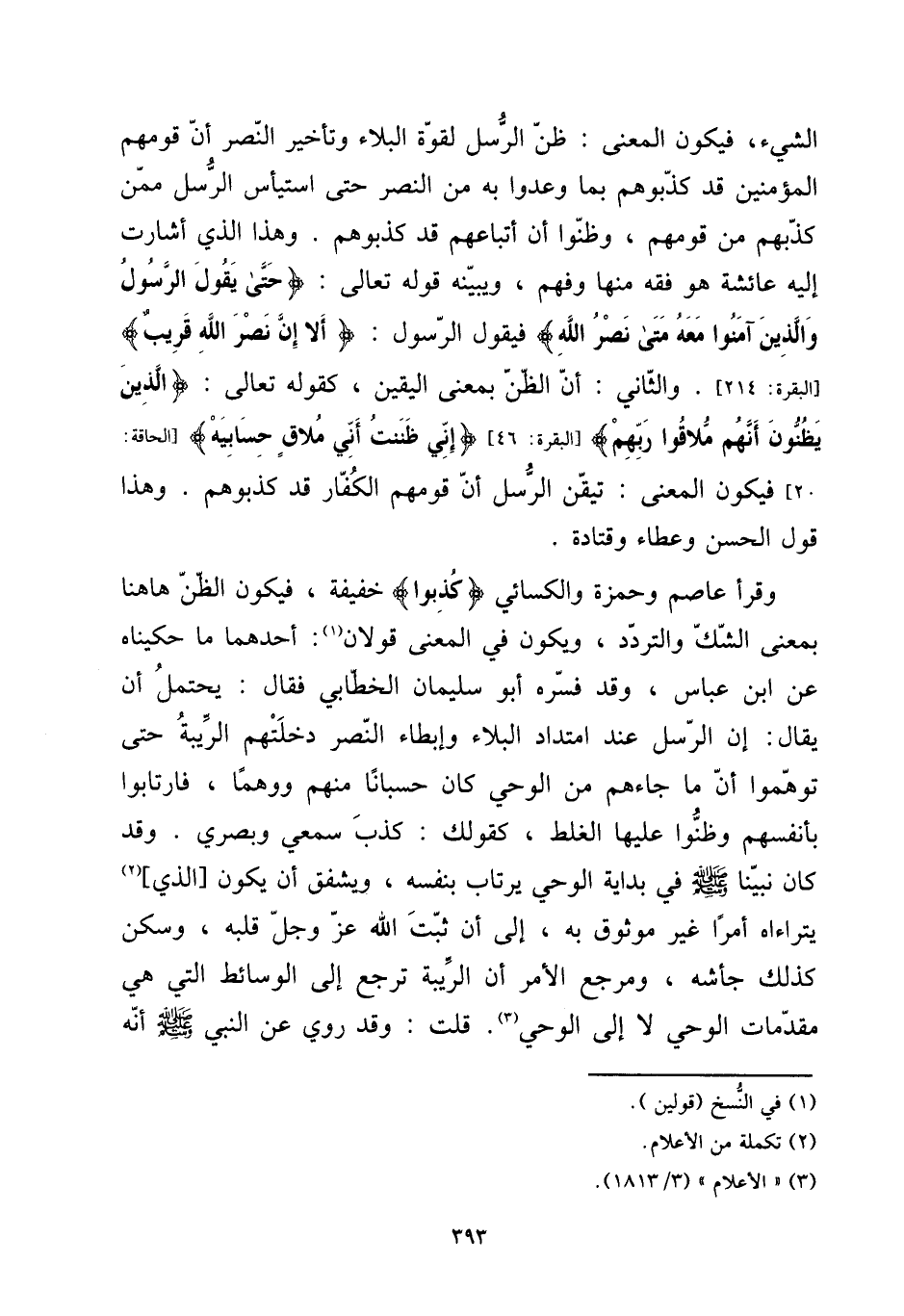 الشَّيْء، فَيكون الْمَعْنى: ظن الرُّسُل لقُوَّة الْبلَاء وَتَأْخِير النَّصْر أَن قَومهمْ الْمُؤمنِينَ قد كذبوهم بِمَا وعدوا بِهِ من النَّصْر حَتَّى استيأس الرُّسُل مِمَّن كذبهمْ من قَومهمْ، وظنوا أَن أتباعهم قد كذبوهم. وَهَذَا الَّذِي أشارت إِلَيْهِ عَائِشَة هُوَ فقه مِنْهَا وَفهم، ويبينه قَوْله تَعَالَى: {حَتَّى يَقُول الرَّسُول وَالَّذين آمنُوا مَعَه مَتى نصر الله} فَيَقُول الرَّسُول: {أَلا إِن نصر الله قريب} [الْبَقَرَة: 214] . وَالثَّانِي: أَن الظَّن بِمَعْنى الْيَقِين، كَقَوْلِه تَعَالَى: {الَّذين يظنون أَنهم ملاقوا رَبهم} [الْبَقَرَة: 46] {إِنِّي ظَنَنْت أَنِّي ملاق حسابيه} [الحاقة: 20] فَيكون الْمَعْنى: تَيَقّن الرُّسُل أَن قَومهمْ الْكفَّار قد كذبوهم. وَهَذَا قَول الْحسن وَعَطَاء وَقَتَادَة. [15] وَقَرَأَ عَاصِم وَحَمْزَة وَالْكسَائِيّ {كذبُوا} خَفِيفَة، فَيكون الظَّن هَاهُنَا بِمَعْنى الشَّك والتردد، وَيكون فِي الْمَعْنى قَولَانِ: أَحدهمَا مَا حكيناه عَن ابْن عَبَّاس، وَقد فسره أَبُو سُلَيْمَان الْخطابِيّ فَقَالَ: يحْتَمل أَن يُقَال: إِن الرُّسُل عِنْد امتداد الْبلَاء وإبطاء النَّصْر دخلتهم الرِّيبَة حَتَّى توهموا أَن مَا جَاءَهُم من الْوَحْي كَانَ حسبانا مِنْهُم ووهما، فارتابوا بِأَنْفسِهِم وظنوا عَلَيْهَا الْغَلَط، كَقَوْلِك: كذب سَمْعِي وبصري. وَقد كَانَ نَبينَا صلى الله عَلَيْهِ وَسلم فِي بداية الْوَحْي يرتاب بِنَفسِهِ، ويشفق أَن يكون [الَّذِي] يتراءاه أمرا غير موثوق بِهِ، إِلَى أَن ثَبت الله عز وَجل قلبه، وَسكن كَذَلِك جأشه، ومرجع الْأَمر أَن الرِّيبَة ترجع إِلَى الوسائط الَّتِي هِيَ مُقَدمَات الْوَحْي لَا إِلَى الْوَحْي. قلت: وَقد رُوِيَ عَن النَّبِي صلى الله عَلَيْهِ وَسلم أَنه