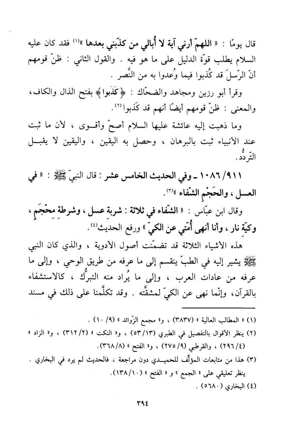 911 - / 1086 وَفِي الحَدِيث الْخَامِس عشر: قَالَ النَّبِي صلى الله عَلَيْهِ وَسلم: " فِي الْعَسَل، والحجم الشِّفَاء ". [15] وَقَالَ ابْن عَبَّاس: " الشِّفَاء فِي ثَلَاثَة: شربة عسل، وشرطة محجم، وكية نَار، وَأَنا أنهى أمتِي عَن الكي " وَرفع الحَدِيث. [15] هَذِه الْأَشْيَاء الثَّلَاثَة قد تَضَمَّنت أصُول الْأَدْوِيَة، وَالَّذِي كَانَ النَّبِي صلى الله عَلَيْهِ وَسلم يُشِير إِلَيْهِ فِي الطِّبّ يَنْقَسِم إِلَى مَا عرفه من طَرِيق الْوَحْي، وَإِلَى مَا عرفه من عادات الْعَرَب، وَإِلَى مَا يُرَاد مِنْهُ التَّبَرُّك، كالاستشفاء بِالْقُرْآنِ، وَإِنَّمَا نهى عَن الكي لمشقته. وَقد تكلما على ذَلِك فِي مُسْند