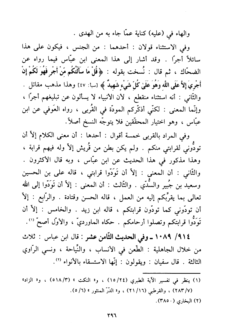 وَالْهَاء فِي (عَلَيْهِ) كِنَايَة عَمَّا جَاءَ بِهِ من الْهدى. [15] وَفِي الِاسْتِثْنَاء قَولَانِ: أَحدهمَا: من الْجِنْس، فَيكون على هَذَا سَائِلًا أجرا. وَقد أَشَارَ إِلَى هَذَا الْمَعْنى ابْن عَبَّاس فِيمَا رَوَاهُ عَن الضَّحَّاك، ثمَّ قَالَ: نسخت بقوله: {قل مَا سألتكم من أجر فَهُوَ لكم إِن أجري إِلَّا على الله وَهُوَ على كل شَيْء شَهِيد} [سبأ: 47] وَهَذَا مَذْهَب مقَاتل. وَالثَّانِي: أَنه اسْتثِْنَاء مُنْقَطع، لِأَن الْأَنْبِيَاء لَا يسْأَلُون عَن تبليغهم أجرا، وَإِنَّمَا الْمَعْنى: لكني أذكركم الْمَوَدَّة فِي الْقُرْبَى، رَوَاهُ الْعَوْفِيّ عَن ابْن عَبَّاس، وَهُوَ اخْتِيَار الْمُحَقِّقين فَلَا يتَوَجَّه النّسخ أصلا. [15] وَفِي المُرَاد بالقربى خَمْسَة أَقْوَال: أَحدهَا: أَن معنى الْكَلَام إِلَّا أَن تودوني لقرابتي مِنْكُم. وَلم يكن بطن من قُرَيْش إِلَّا وَله فيهم قرَابَة، وَهَذَا مَذْكُور فِي هَذَا الحَدِيث عَن ابْن عَبَّاس، وَبِه قَالَ الْأَكْثَرُونَ. وَالثَّانِي: إِن الْمَعْنى: إِلَّا أَن تودوا قَرَابَتي، قَالَه على بن الْحُسَيْن وَسَعِيد بن جُبَير وَالسُّديّ. وَالثَّالِث: أَن الْمَعْنى: إِلَّا أَن تودوا إِلَى الله تَعَالَى بِمَا يقربكم إِلَيْهِ من الْعَمَل، قَالَه الْحسن وَقَتَادَة. وَالرَّابِع: إِلَّا أَن تودوني كَمَا تودون قرابتكم، قَالَه ابْن زيد. وَالْخَامِس: إِلَّا أَن تودوا قرابتكم وتصلوا أَرْحَامكُم. حَكَاهُ الْمَاوَرْدِيّ، وَالْأول أصح.