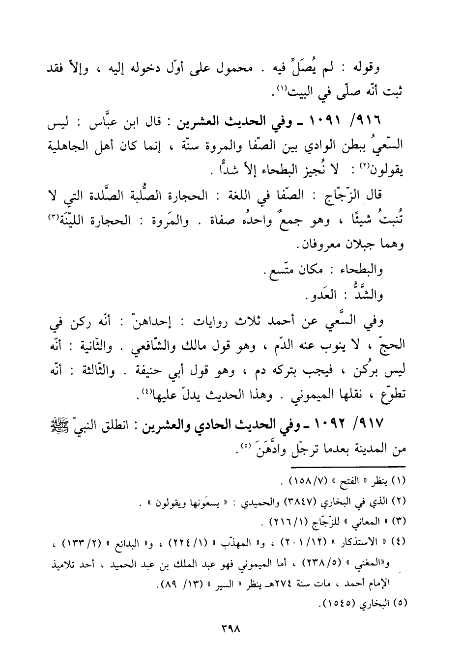 916 - / 1091 وَفِي الحَدِيث الْعشْرين: قَالَ ابْن عَبَّاس: لَيْسَ السَّعْي بِبَطن الْوَادي بَين الصَّفَا والمروة سنة، إِنَّمَا كَانَ أهل الْجَاهِلِيَّة يَقُولُونَ: لَا نجيز الْبَطْحَاء إِلَّا شدا. [15] قَالَ الزّجاج: الصَّفَا فِي اللُّغَة: الْحِجَارَة الصلبة الصلدة الَّتِي لَا تنْبت شَيْئا، وَهُوَ جمع واحده صفاة. والمرة: الْحِجَارَة اللينة وهما جبلان معروفان. [15] والبطحاء: مَكَان متسع. [15] والشد: الْعَدو. [15] وَفِي السَّعْي عَن أَحْمد ثَلَاث رِوَايَات: إِحْدَاهُنَّ: أَنه ركن فِي الْحَج، لَا يَنُوب عَنهُ الدَّم، وَهُوَ قَول مَالك وَالشَّافِعِيّ. وَالثَّانيَِة: أَنه لَيْسَ بِرُكْن، فَيجب بِتَرْكِهِ دم، وَهُوَ قَول أبي حنيفَة. وَالثَّالِثَة: أَنه تطوع، نقلهَا الْمَيْمُونِيّ. وَهَذَا الحَدِيث يدل عَلَيْهَا.