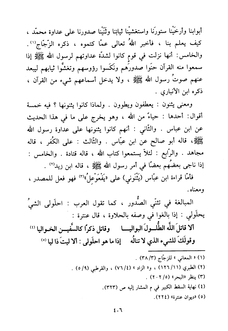 أبوابنا وأرخينا ستورنا واستغشينا ثيابنا وثنينا صدورنا على عَدَاوَة مُحَمَّد، كَيفَ يعلم بِنَا، فَأخْبر الله تَعَالَى عَمَّا كتموه، ذكره الزّجاج. وَالْخَامِس: أَنَّهَا نزلت فِي قوم كَانُوا لشدَّة عداوتهم لرَسُول الله صلى الله عَلَيْهِ وَسلم إِذا سمعُوا مِنْهُ الْقُرْآن حنوا صُدُورهمْ ونكسوا رؤوسهم وتغشوا ثِيَابهمْ ليبعد عَنْهُم صَوت رَسُول الله صلى الله عَلَيْهِ وَسلم، وَلَا يدْخل أسماعهم شَيْء من الْقُرْآن، ذكره ابْن الْأَنْبَارِي. [15] وَمعنى يثنون: يعطفون ويطوون. ولماذا كَانُوا يثنونها؟ فِيهِ خَمْسَة أَقْوَال: أَحدهَا: حَيَاء من الله، وَهُوَ يخرج على مَا فِي هَذَا الحَدِيث عَن ابْن عَبَّاس. وَالثَّانِي: أَنهم كَانُوا يثنونها على عَدَاوَة رَسُول الله صلى الله عَلَيْهِ وَسلم، قَالَه أَبُو صَالح عَن ابْن عَبَّاس. وَالثَّالِث: على الْكفْر، قَالَه مُجَاهِد. وَالرَّابِع: لِئَلَّا ليستمعوا كتاب الله، قَالَه قَتَادَة. وَالْخَامِس: إِذا ناجى بَعضهم بَعْضًا فِي أَمر رَسُول الله صلى الله عَلَيْهِ وَسلم، قَالَه ابْن زيد. [15] فَأَما قِرَاءَة ابْن عَبَّاس (يثنوني) على " يفعوعل " فَهُوَ فعل للمصدر، وَمَعْنَاهُ. [15] الْمُبَالغَة فِي تثني الصُّدُور، كَمَا تَقول الْعَرَب: احلولي الشي يحلولي: إِذا بالغوا فِي وَصفه بالحلاوة، قَالَ عنترة: