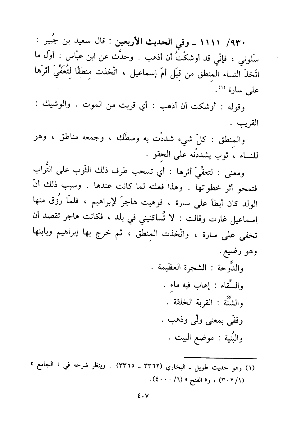 930 - / 1111 وَفِي الحَدِيث الْأَرْبَعين: قَالَ سعيد بن جُبَير: سلوني، فَإِنِّي قد أوشكت أَن أذهب. وَحدث عَن ابْن عَبَّاس: أول مَا اتخذ النِّسَاء الْمنطق من قبل أم إِسْمَاعِيل، اتَّخذت منطقا لتعفي أَثَرهَا على سارة. [15] وَقَوله: أوشكت أَن أذهب: أَي قربت من الْمَوْت. والوشيك: الْقَرِيب. [15] والمنطق: كل شَيْء شددت بِهِ وسطك، وَجمعه مناطق، وَهُوَ للنِّسَاء، ثوب يشددنه على الحقو. [15] وَمعنى: لتعفي أَثَرهَا: أَي تسحب طرف ذَلِك الثَّوْب على التُّرَاب فتمحو أثر خطواتها. وَهَذَا فعلته لما كَانَت عِنْدهَا. وَسبب ذَلِك أَن الْوَلَد كَانَ أَبْطَأَ على سارة، فَوهبت هَاجر لإِبْرَاهِيم، فَلَمَّا رزق مِنْهَا إِسْمَاعِيل غارت وَقَالَت: لَا تساكنيني فِي بلد، فَكَانَت هَاجر تقصد أَن تخفى على سارة، واتخذت الْمنطق، ثمَّ خرج بهَا إِبْرَاهِيم وبابنها وَهُوَ رَضِيع. [15] والدوحة: الشَّجَرَة الْعَظِيمَة. [15] والسقاء: إهَاب فِيهِ مَاء. [15] والشنة: الْقرْبَة الْخلقَة. [15] وقفى بِمَعْنى ولى وَذهب. [15] والبنية: مَوضِع الْبَيْت.