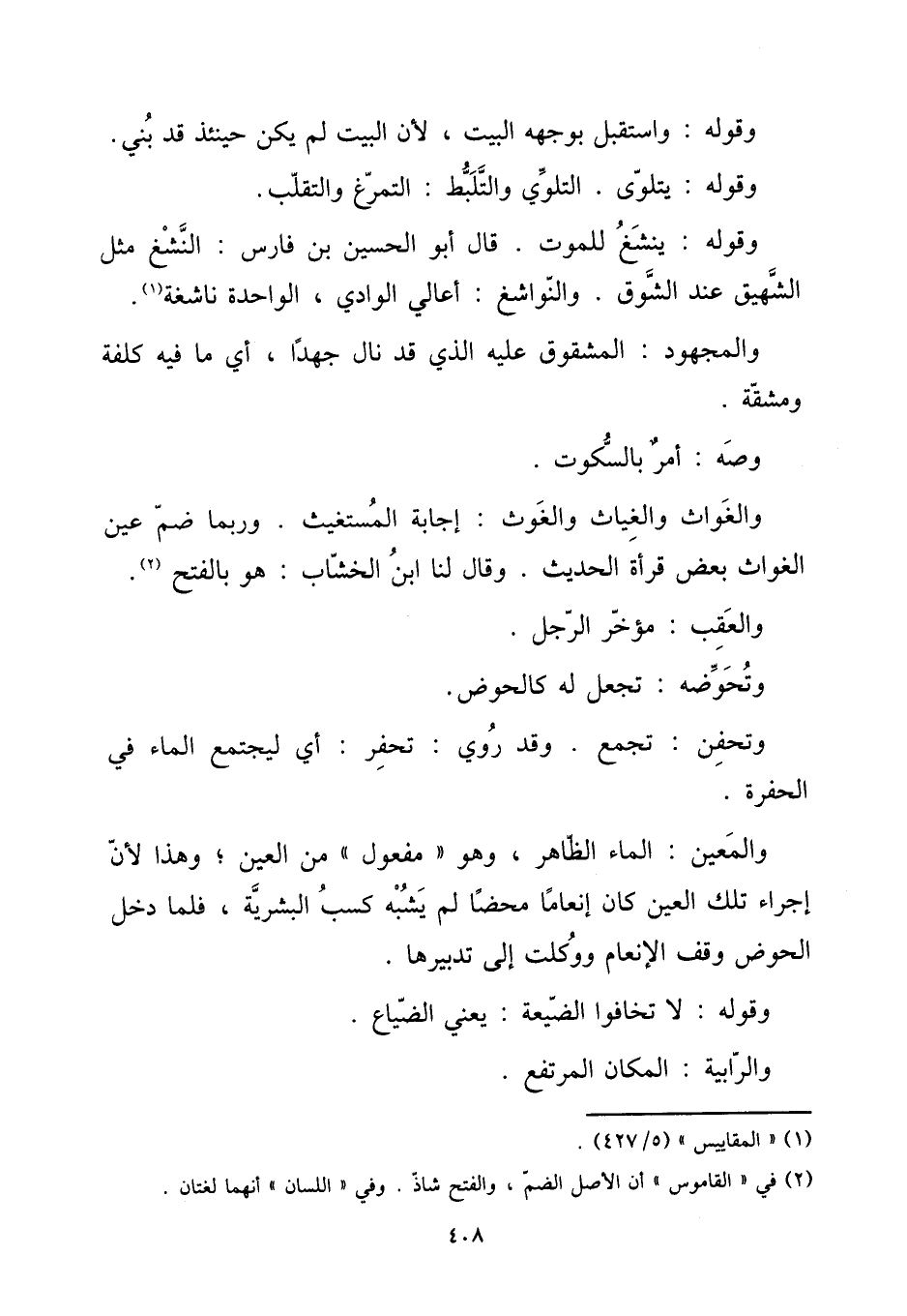 [15] وَقَوله: واستقبل بِوَجْهِهِ الْبَيْت، لِأَن الْبَيْت لم يكن حِينَئِذٍ قد بني. [15] وَقَوله: يتلوى. التلوي والتلبط: التمرغ والتقلب. [15] وَقَوله: ينشغ للْمَوْت. قَالَ أَبُو الْحُسَيْن بن فَارس: النشغ مثل الشهيق عِنْد الشوق. والنواشغ: أعالي الْوَادي، الْوَاحِدَة ناشغة. [15] والمجهود: المشقوق عَلَيْهِ الَّذِي قد نَالَ جهدا، أَي مَا فِيهِ كلفة ومشقة. [15] وصه: أَمر بِالسُّكُوتِ. [15] والغواث والغياث والغوث: إِجَابَة المتسغيث. وَرُبمَا ضم عين الغواث بعض قرأة الحَدِيث. وَقَالَ لنا ابْن الخشاب: هُوَ بِالْفَتْح. [15] والعقب: مُؤخر الرجل. [15] وتحوضه: تجْعَل لَهُ كالحوض. [15] وتحفن: تجمع. وَقد رُوِيَ: تحفر: أَي ليجتمع المَاء فِي الحفرة. [15] والمعين: المَاء الظَّاهِر، وَهُوَ " مفعول " من الْعين؛ وَهَذَا لِأَن إِجْرَاء تِلْكَ الْعين كَانَ إنعاما مَحْضا لم يشبه كسب البشرية، فَلَمَّا دخل الْحَوْض وقف الإنعام ووكلت إِلَى تدبيرها. [15] وَقَوله: لَا تخافوا الضَّيْعَة: يَعْنِي الضّيَاع. والرابية: الْمَكَان الْمُرْتَفع.