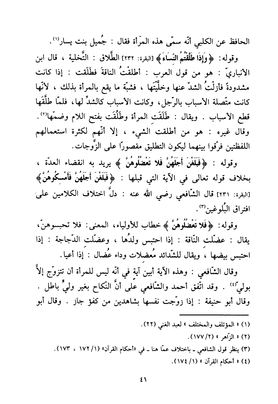 الْحَافِظ عَن الْكَلْبِيّ أَنه سمى هَذِه الْمَرْأَة فَقَالَ: جميل بنت يسَار. [15] وَقَوله: {وَإِذا طلّقْتُم النِّسَاء} [الْبَقَرَة: 232] الطَّلَاق: التَّخْلِيَة، قَالَ ابْن الْأَنْبَارِي: هُوَ من قَول الْعَرَب: أطلقت النَّاقة فَطلقت: إِذا كَانَت مشدودة فأزلت الشد عَنْهَا وخليتها، فَشبه مَا يَقع بِالْمَرْأَةِ بذلك، لِأَنَّهَا كَانَت مُتَّصِلَة الْأَسْبَاب بِالرجلِ، وَكَانَت الْأَسْبَاب كالشد لَهَا، فَلَمَّا طَلقهَا قطع الْأَسْبَاب. وَيُقَال: طلقت الْمَرْأَة وَطلقت بِفَتْح اللَّام وَضمّهَا. وَقَالَ غَيره: هُوَ من أطلقت الشَّيْء، إِلَّا أَنهم لِكَثْرَة استعمالهم اللفظتين فرقوا بَينهمَا ليَكُون التَّطْلِيق مَقْصُورا على الزَّوْجَات. [15] وَقَوله: {فبلغن أَجلهنَّ فَلَا تعضلوهن} يُرِيد بِهِ انْقِضَاء الْعدة، بِخِلَاف قَوْله تَعَالَى فِي الْآيَة الَّتِي قبلهَا: {فبلغن أَجلهنَّ فأمسكوهن} [الْبَقَرَة: 231] قَالَ الشَّافِعِي رَضِي الله عَنهُ: دلّ اخْتِلَاف الْكَلَامَيْنِ على افْتِرَاق البلوغين. [15] وَقَوله: {فَلَا تعضلوهن} خطاب للأولياء، الْمَعْنى: فَلَا تحبسوهن، يُقَال: عضلت النَّاقة: إِذا احْتبسَ وَلَدهَا، وعضلت الدَّجَاجَة: إِذا احْتبسَ بيضها، وَيُقَال للشدائد معضلات وداء عضال: إِذا أعيا. [15] وَقَالَ الشَّافِعِي: وَهَذِه الْآيَة أبين آيَة فِي أَنه لَيْسَ للْمَرْأَة أَن تتَزَوَّج إِلَّا بولِي. وَقد اتّفق أَحْمد وَالشَّافِعِيّ على أَن النِّكَاح بِغَيْر ولي بَاطِل. وَقَالَ أَبُو حنيفَة: إِذا زوجت نَفسهَا بِشَاهِدين من كفؤ جَازَ. وَقَالَ أَبُو