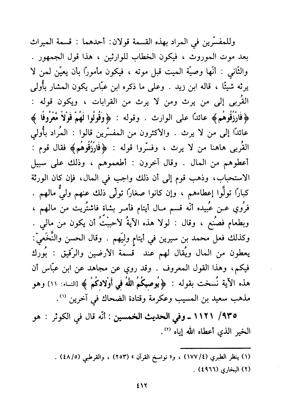 [15] وللمفسرين فِي المُرَاد بِهَذِهِ الْقِسْمَة قَولَانِ: أَحدهمَا: قسْمَة الْمِيرَاث بعد موت الْمَوْرُوث، فَيكون الْخطاب للوارثين، هَذَا قَول الْجُمْهُور. وَالثَّانِي: أَنَّهَا وَصِيَّة الْمَيِّت قبل مَوته، فَيكون مَأْمُورا بِأَن يعين لمن لَا يَرِثهُ شَيْئا، قَالَه ابْن زيد. وعَلى مَا ذكره ابْن عَبَّاس يكون الْمشَار بِأولى الْقُرْبَى إِلَى من يَرث وَمن لَا يَرث من الْقرَابَات، وَيكون قَوْله: {فارزقوهم} عَائِدًا على الْوَارِث. وَقَوله: {وَقُولُوا لَهُم قولا مَعْرُوفا} عَائِدًا إِلَى من لَا يَرث. وَالْأَكْثَرُونَ من الْمُفَسّرين قَالُوا: المُرَاد بأولي الْقُرْبَى هَاهُنَا من لَا يَرث، وفسروا قَوْله: {فارزقوهم} فَقَالَ قوم: أعطوهم من المَال. وَقَالَ آخَرُونَ: أطعموهم، وَذَلِكَ على سَبِيل الِاسْتِحْبَاب، وَذهب قوم إِلَى أَن ذَلِك وَاجِب فِي المَال، فَإِن كَانَ الْوَرَثَة كبارًا توَلّوا إعطاءهم، وَإِن كَانُوا صغَارًا تولى ذَلِك عَنْهُم ولي مَالهم. فَروِيَ عَن عبيده أَنه قسم مَال أَيْتَام فَأمر بِشَاة فاشتريت من مَالهم، وبطعام فَصنعَ، وَقَالَ: لَوْلَا هَذِه الْآيَة لأحببت أَن يكون من مَالِي. وَكَذَلِكَ فعل مُحَمَّد بن سِيرِين فِي أَيْتَام وليهم. وَقَالَ الْحسن وَالنَّخَعِيّ: يُعْطون من المَال وَيُقَال لَهُم عِنْد قسْمَة الْأَرْضين وَالرَّقِيق: بورك فِيكُم، وَهَذَا القَوْل الْمَعْرُوف. وَقد رُوِيَ عَن مُجَاهِد عَن ابْن عَبَّاس أَن هَذِه الْآيَة نسخت بقوله: {يُوصِيكُم الله فِي أَوْلَادكُم} [النِّسَاء: 11] وَهُوَ مَذْهَب سعيد بن الْمسيب وَعِكْرِمَة وَقَتَادَة الضَّحَّاك فِي آخَرين.