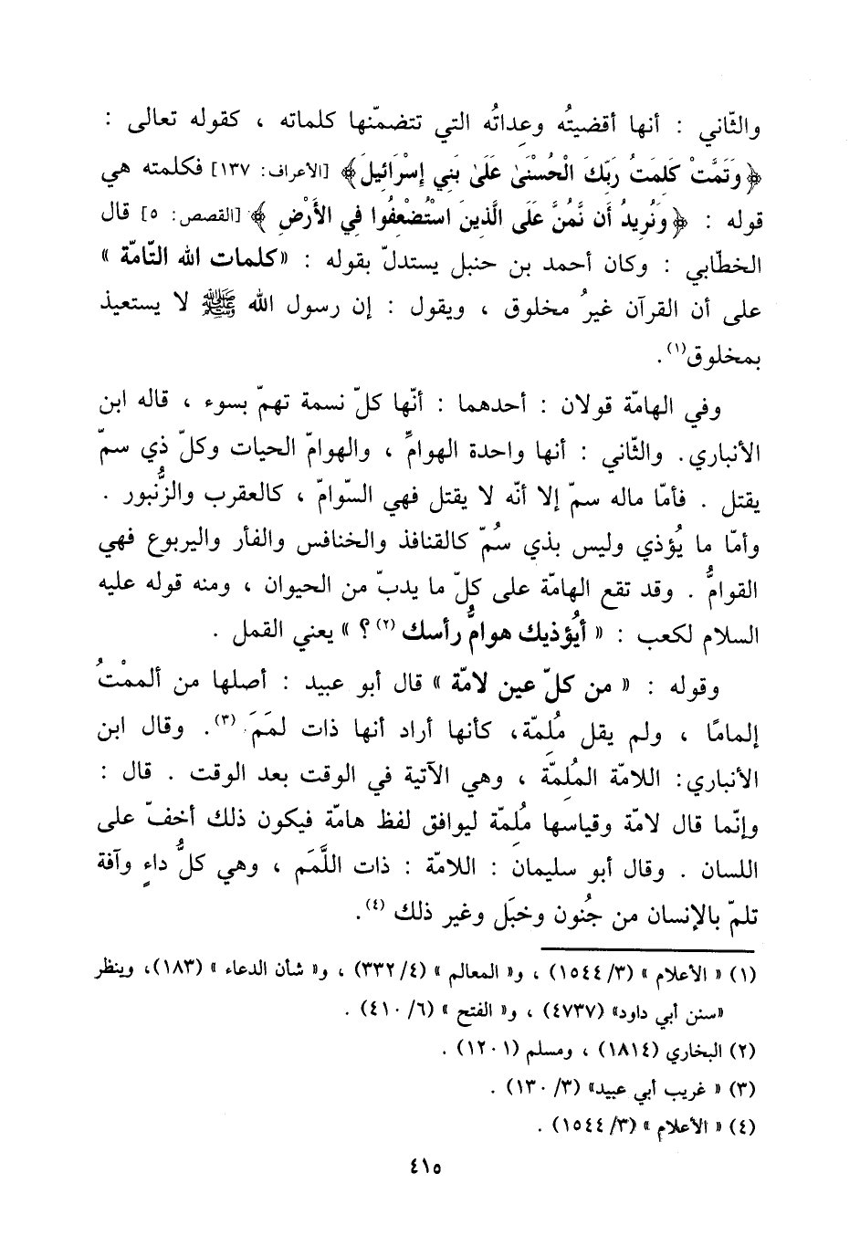 وَالثَّانِي: أَنَّهَا أقضيته وعداته الَّتِي تتضمنها كَلِمَاته، كَقَوْلِه تَعَالَى: {وتمت كلمت رَبك الْحسنى على بني إِسْرَائِيل} [الْأَعْرَاف: 137] فكلمته هِيَ قَوْله: {ونريد أَن نمن على الَّذين استضعفوا فِي الأَرْض} [الْقَصَص: 5] قَالَ الْخطابِيّ: وَكَانَ أَحْمد بن حَنْبَل يسْتَدلّ بقوله: " كَلِمَات الله التَّامَّة " على أَن الْقُرْآن غير مَخْلُوق، وَيَقُول: إِن رَسُول الله صلى الله عَلَيْهِ وَسلم لَا يستعيذ بمخلوق. [15] وَفِي الهامة قَولَانِ: أَحدهمَا: أَنَّهَا كل نسمَة تهم بِسوء، قَالَه ابْن الْأَنْبَارِي. وَالثَّانِي: أَنَّهَا وَاحِدَة الْهَوَام، والهوام الْحَيَّات وكل ذِي سم يقتل. فَأَما مَاله سم إِلَّا أَنه لَا يقتل فَهِيَ السوام، كالعقرب والزنبور. وَأما مَا يُؤْذِي وَلَيْسَ بِذِي سم كالقنافذ والخنافس والفأر واليربوع فَهِيَ القوام. وَقد تقع الهامة على كل مَا يدب من الْحَيَوَان، وَمِنْه قَوْله عَلَيْهِ السَّلَام لكعب: " أَيُؤْذِيك هوَام رَأسك؟ " يَعْنِي الْقمل. [15] وَقَوله: " من كل عين لَامة " قَالَ أَبُو عبيد: أَصْلهَا من أَلممْت إلماما، وَلم يقل ملمة، كَأَنَّهَا أَرَادَ أَنَّهَا ذَات لمَم. وَقَالَ ابْن الْأَنْبَارِي: اللامة الملمة، وَهِي الْآتِيَة فِي الْوَقْت بعد الْوَقْت. قَالَ: وَإِنَّمَا قَالَ لَامة وقياسها ملمة ليُوَافق لفظ هَامة فَيكون ذَلِك أخف على اللِّسَان. وَقَالَ أَبُو سُلَيْمَان: اللامة: ذَات اللمم، وَهِي كل دَاء وَآفَة تلم بالإنسان من جُنُون وخبل وَغير ذَلِك.