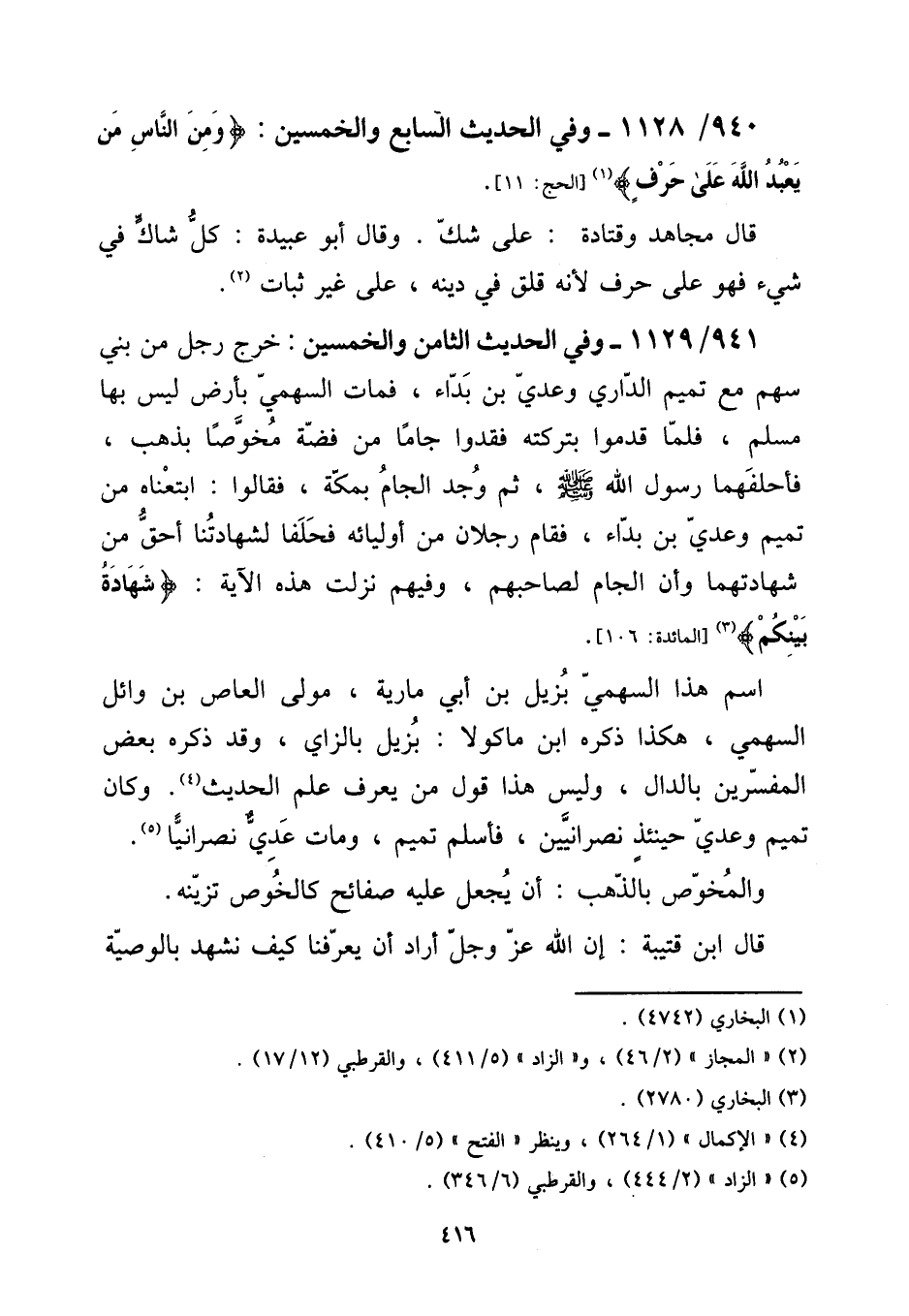941 - / 1129 وَفِي الحَدِيث الثَّامِن وَالْخمسين: خرج رجل من بني سهم مَعَ تَمِيم الدَّارِيّ وعدي بن بداء، فَمَاتَ السَّهْمِي بِأَرْض لَيْسَ بهَا مُسلم، فَلَمَّا قدمُوا بِتركَتِهِ فقدوا جَاما من فضَّة مخوصا بِذَهَب، فَأَحْلفهُمَا رَسُول الله صلى الله عَلَيْهِ وَسلم، ثمَّ وجد الْجَام بِمَكَّة، فَقَالُوا: ابتعناه من تَمِيم وعدي بن بداء، فَقَامَ رجلَانِ من أوليائه فَحَلفا لَشَهَادَتنَا أَحَق من شَهَادَتهمَا وَأَن الْجَام لصَاحِبِهِمْ، وَفِيهِمْ نزلت هَذِه الْآيَة: {شَهَادَة بَيْنكُم} [الْمَائِدَة: 106] . [15] اسْم هَذَا السَّهْمِي بزيل بن أبي مَارِيَة، مولى الْعَاصِ بن وَائِل السَّهْمِي، هَكَذَا ذكره ابْن مَاكُولَا: بزيل بالزاي، وَقد ذكره بعض الْمُفَسّرين بِالدَّال، وَلَيْسَ هَذَا قَول من يعرف علم الحَدِيث. وَكَانَ تَمِيم وعدي حِينَئِذٍ نَصْرَانِيين، فَأسلم تَمِيم، وَمَات عدي نَصْرَانِيّا. [15] والمخوص بِالذَّهَب: أَن يَجْعَل عَلَيْهِ صَفَائِح كالخوص تزينه. [15] قَالَ ابْن قُتَيْبَة: إِن الله عز وَجل أَرَادَ أَن يعرفنا كَيفَ نشْهد بِالْوَصِيَّةِ