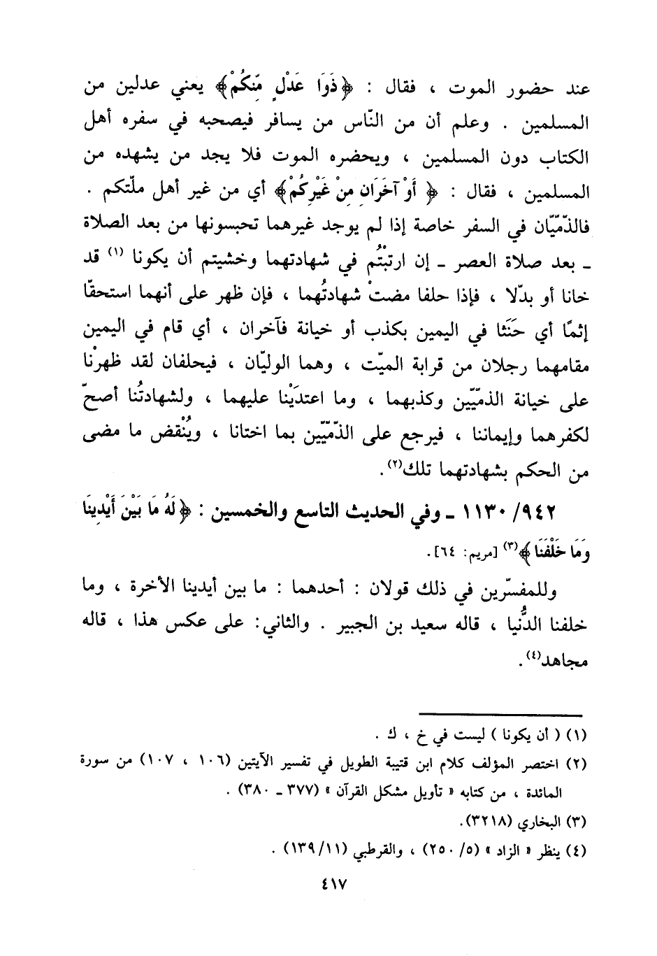 عِنْد حُضُور الْمَوْت، فَقَالَ: {ذَوا عدل مِنْكُم} يَعْنِي عَدْلَيْنِ من الْمُسلمين. وَعلم أَن من النَّاس من يُسَافر فيصحبه فِي سَفَره أهل الْكتاب دون الْمُسلمين، ويحضره الْمَوْت فَلَا يجد من يشهده من من الْمُسلمين، فَقَالَ: {أَو آخرَانِ من غَيْركُمْ} أَي من غير أهل ملتكم. فالذميان فِي السّفر خَاصَّة إِذا لم يُوجد غَيرهمَا تحبسونها من بعد الصَّلَاة - بعد صَلَاة الْعَصْر - إِن ارتبتم فِي شَهَادَتهمَا وخشيتم أَن يَكُونَا قد خَانا أَو بَدَلا، فَإِذا حلفا مَضَت شَهَادَتهمَا، فَإِن ظهر على أَنَّهُمَا استحقا إِثْمًا أَي حنثا فِي الْيَمين بكذب أَو خِيَانَة فآخران، أَي قَامَ فِي الْيَمين مقامهما رجلَانِ من قرَابَة الْمَيِّت، وهما الوليان، فيحلفان لقد ظهرنا على خِيَانَة الذميين وكذبهما، وَمَا اعتدينا عَلَيْهِمَا، ولشهادتنا أصح لكفرهما وإيماننا، فَيرجع على الذميين بِمَا اختانا، وينقض مَا مضى من الحكم بِشَهَادَتِهِمَا تِلْكَ.