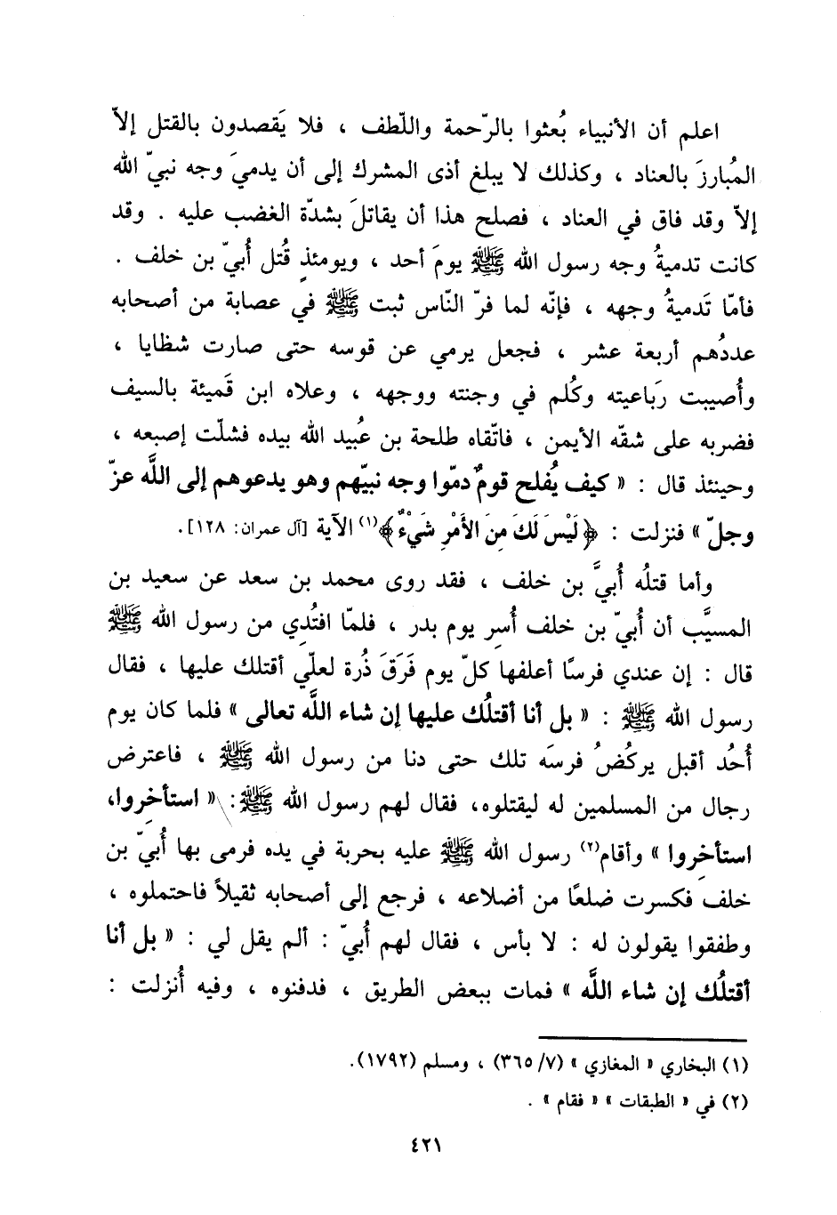 [15] اعْلَم أَن الْأَنْبِيَاء بعثوا بِالرَّحْمَةِ واللطف، فَلَا يقصدون بِالْقَتْلِ إِلَّا المبارز بالعناد، وَكَذَلِكَ لَا يبلغ أَذَى الْمُشرك إِلَى أَن يدمي وَجه نَبِي الله إِلَّا وَقد فاق فِي العناد، فصلح هَذَا أَن يُقَاتل بِشدَّة الْغَضَب عَلَيْهِ. وَقد كَانَت تدمية وَجه رَسُول صلى الله عَلَيْهِ وَسلم يَوْم أحد، ويومئذ قتل أبي بن خلف. فَأَما تدمية وَجهه، فَإِنَّهُ لما فر النَّاس ثَبت صلى الله عَلَيْهِ وَسلم فِي عِصَابَة من أَصْحَابه عَددهمْ أَرْبَعَة عشر، فَجعل يَرْمِي عَن قوسه حَتَّى صَارَت شظايا، وَأُصِيبَتْ رباعيته وكلم فِي وجنته وَوَجهه، وعلاه ابْن قميئة بِالسَّيْفِ فَضَربهُ على شقَّه الْأَيْمن، فاتقاه طَلْحَة بن عبيد الله بِيَدِهِ فشلت إصبعه، وَحِينَئِذٍ قَالَ: " كَيفَ يفلح قوم دموا وَجه نَبِيّهم وَهُوَ يَدعُوهُم إِلَى الله عز وَجل " فَنزلت: {لَيْسَ لَك من الْأَمر شَيْء} الْآيَة [آل عمرَان: 128] . [15] وَأما قَتله أبي بن خلف، فقد روى مُحَمَّد بن سعد عَن سعيد بن الْمسيب أَن أبي بن خلف أسر يَوْم بدر، فَلَمَّا افتدي من رَسُول الله صلى الله عَلَيْهِ وَسلم قَالَ: إِن عِنْدِي فرسا أعلفها كل يَوْم فرق ذرة لعَلي أَقْتلك عَلَيْهَا، فَقَالَ رَسُول الله صلى الله عَلَيْهِ وَسلم: " بل أَنا أَقْتلك عَلَيْهَا إِن شَاءَ الله تَعَالَى " فَلَمَّا كَانَ يَوْم أحد أقبل يرْكض فرسه تِلْكَ حَتَّى دنا من رَسُول الله صلى الله عَلَيْهِ وَسلم، فَاعْترضَ رجال من الْمُسلمين لَهُ ليقتلوه، فَقَالَ لَهُم رَسُول الله صلى الله عَلَيْهِ وَسلم: " استأخروا، استأخروا " وَأقَام رَسُول الله صلى الله عَلَيْهِ وَسلم عَلَيْهِ بِحَرْبَة فِي يَده فَرمى بهَا أبي بن خلف فَكسرت ضلعا من أضلاعه، فَرجع إِلَى أَصْحَابه ثقيلا فاحتملوه، وَطَفِقُوا يَقُولُونَ لَهُ: لَا بَأْس، فَقَالَ لَهُم أبي: ألم يقل لي: " بل أَنا أَقْتلك إِن شَاءَ الله " فَمَاتَ بِبَعْض الطَّرِيق، فدفنوه، وَفِيه أنزلت: