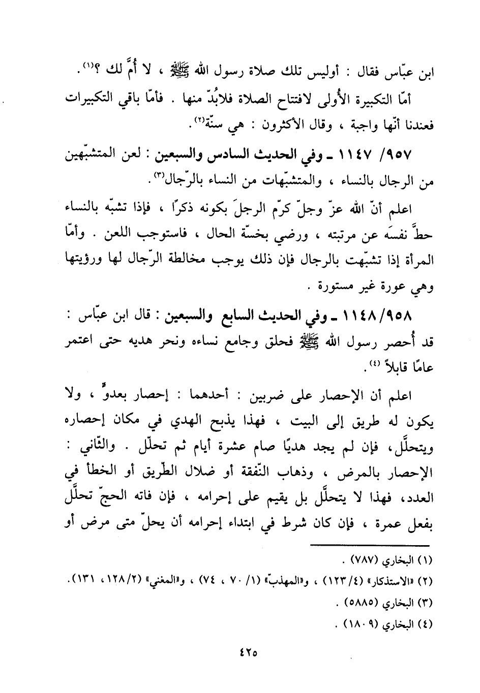 958 - / 1148 وَفِي الحَدِيث السَّابِع وَالسبْعين: قَالَ ابْن عَبَّاس: قد أحْصر رَسُول الله صلى الله عَلَيْهِ وَسلم فحلق وجامع نِسَاءَهُ وَنحر هَدْيه حَتَّى اعْتَمر عَاما قَابلا. [15] اعْلَم أَن الْإِحْصَار على ضَرْبَيْنِ: أَحدهمَا: إحصار بعدو، وَلَا يكون لَهُ طَرِيق إِلَى الْبَيْت، فَهَذَا يذبح الْهَدْي فِي مَكَان إحصاره ويتحلل، فَإِن لم يجد هَديا صَامَ عشرَة أَيَّام ثمَّ تحلل. وَالثَّانِي: الْإِحْصَار بِالْمرضِ، وَذَهَاب النَّفَقَة أَو ضلال الطَّرِيق أَو الْخَطَأ فِي الْعدَد، فَهَذَا لَا يتَحَلَّل بل يُقيم على إِحْرَامه، فَإِن فَاتَهُ الْحَج تحلل بِفعل عمْرَة، فَإِن كَانَ شَرط فِي ابْتِدَاء إِحْرَامه أَن يحل مَتى مرض أَو