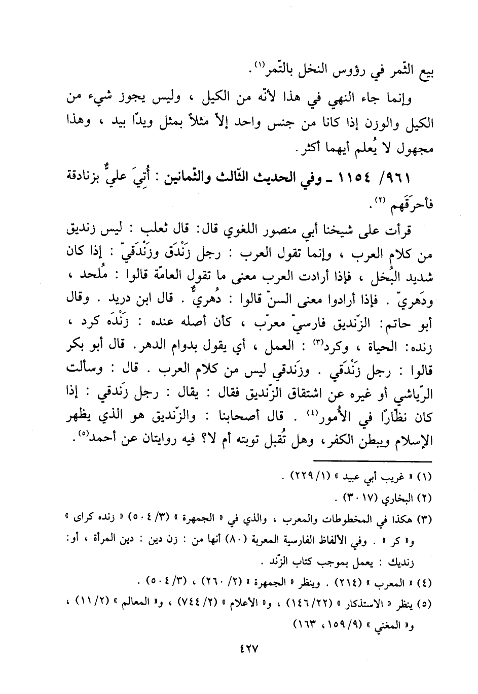 961 - / 1154 وَفِي الحَدِيث الثَّالِث والثمانين: أُتِي عَليّ بزنادقة فاحرقهم. [15] قَرَأت على شَيخنَا أبي مَنْصُور اللّغَوِيّ قَالَ: قَالَ ثَعْلَب: لَيْسَ زنديق من كَلَام الْعَرَب، وَإِنَّمَا تَقول الْعَرَب: رجل زندق وزندقي: إِذا كَانَ شَدِيد الْبُخْل، فَإِذا أَرَادَت الْعَرَب معنى مَا تَقول الْعَامَّة قَالُوا: ملحد، ودهري. فَإِذا أَرَادوا معنى السن قَالُوا: دهري. قَالَ ابْن دُرَيْد. وَقَالَ أَبُو حَاتِم: الزنديق فَارسي مُعرب، كَأَن أَصله عِنْده: زنده كرد، زنده: الْحَيَاة، وكرد: الْعَمَل، أَي يَقُول بدوام الدَّهْر. قَالَ أَبُو بكر قَالُوا: رجل زندقي. وزندقي لَيْسَ من كَلَام الْعَرَب. قَالَ: وَسَأَلت الرياشي أَو غَيره عَن اشتقاق الزنديق فَقَالَ: يُقَال: رجل زندقي: إِذا كَانَ نظارا فِي الْأُمُور. قَالَ أَصْحَابنَا: والزنديق هُوَ الَّذِي يظْهر الْإِسْلَام ويبطن الْكفْر، وَهل تقبل تَوْبَته أم لَا؟ فِيهِ رِوَايَتَانِ عَن أَحْمد.