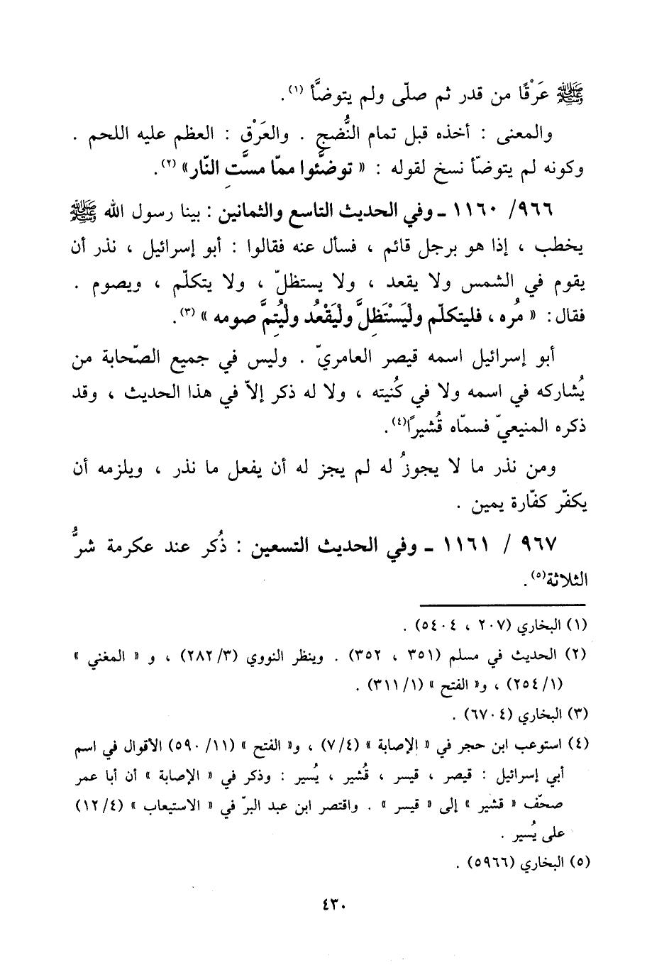 966 - / 1160 وَفِي الحَدِيث التَّاسِع والثمانين: بَينا رَسُول الله صلى الله عَلَيْهِ وَسلم يخْطب، إِذا هُوَ بِرَجُل قَائِم، فَسَأَلَ عَنهُ فَقَالُوا: أَبُو إِسْرَائِيل، نذر أَن يقوم فِي الشَّمْس وَلَا يقْعد، وَلَا يستظل، وَلَا يتَكَلَّم، ويصوم. فَقَالَ: " مره، فَلْيَتَكَلَّمْ وليستظل وليقعد وليتم صَوْمه ". [15] أَبُو إِسْرَائِيل اسْمه قَيْصر العامري. وَلَيْسَ فِي جَمِيع الصَّحَابَة من يُشَارِكهُ فِي اسْمه وَلَا فِي كنيته، وَلَا لَهُ ذكر إِلَّا فِي هَذَا الحَدِيث، وَقد ذكره المنيعي فَسَماهُ قشيرا. [15] وَمن نذر مَا لَا يجوز لَهُ لم يجز لَهُ أَن يفعل مَا نذر، وَيلْزمهُ أَن يكفر كَفَّارَة يَمِين.