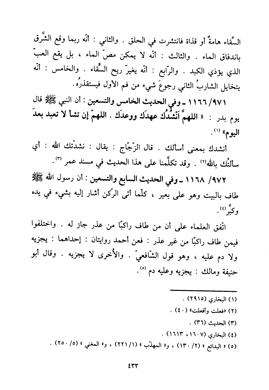 972 - / 1168 وَفِي الحَدِيث السَّابِع وَالتسْعين: أَن رَسُول الله صلى الله عَلَيْهِ وَسلم طَاف بِالْبَيْتِ وَهُوَ على بعير، كلما أَتَى الرُّكْن أَشَارَ إِلَيْهِ بِشَيْء فِي يَده وَكبر. [15] اتّفق الْعلمَاء على أَن من طَاف رَاكِبًا من عذر جَازَ لَهُ. وَاخْتلفُوا فِيمَن طَاف رَاكِبًا من غير عذر: فَعَن أَحْمد رِوَايَتَانِ: إِحْدَاهمَا: يجْزِيه وَلَا دم عَلَيْهِ، وَهُوَ قَول الشَّافِعِي. وَالْأُخْرَى لَا يجْزِيه. وَقَالَ أَبُو حنيفَة وَمَالك: يجْزِيه وَعَلِيهِ دم.