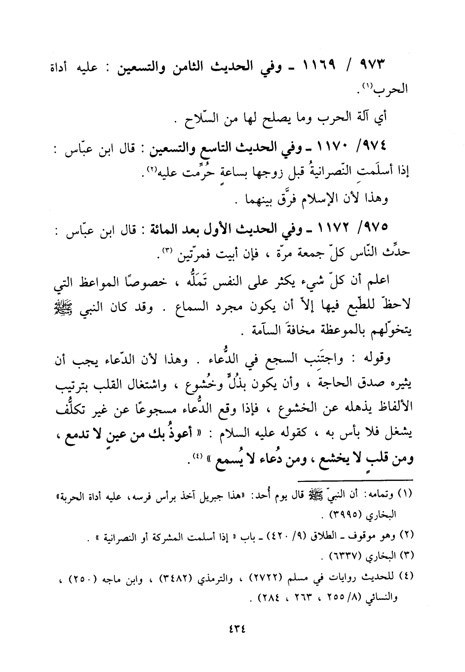 973 - / 1169 وَفِي الحَدِيث الثَّامِن وَالتسْعين: عَلَيْهِ أَدَاة الْحَرْب. أَي آلَة الْحَرْب وَمَا يصلح لَهَا من السِّلَاح.