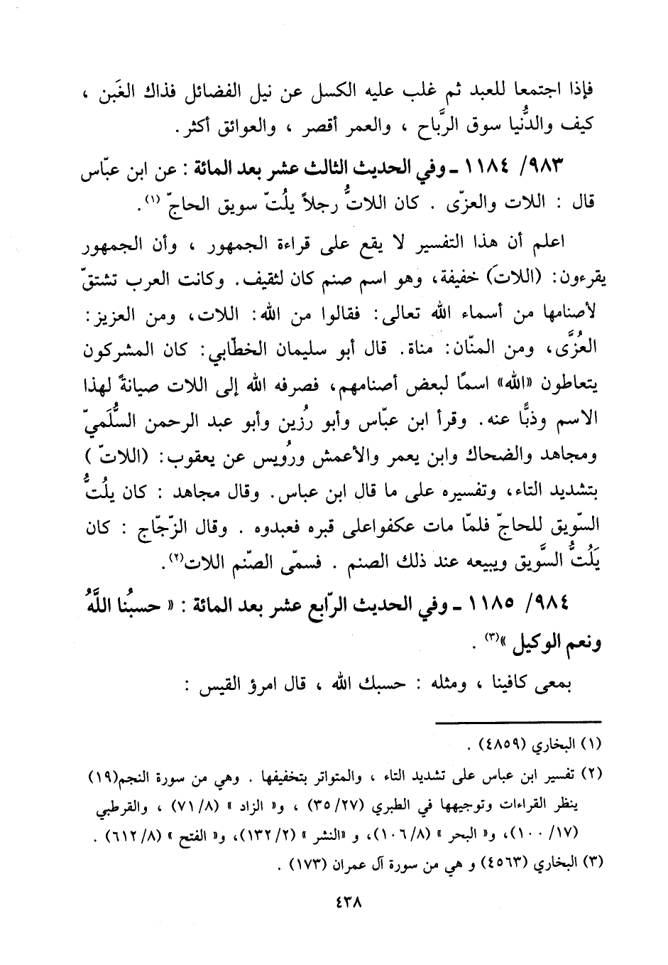 984 - / 1185 - وَفِي الحَدِيث الرَّابِع عشر بعد الْمِائَة: " حَسبنَا الله وَنعم الْوَكِيل ". [15] بمعى كافينا، وَمثله: حَسبك الله، قَالَ امْرُؤ الْقَيْس:
