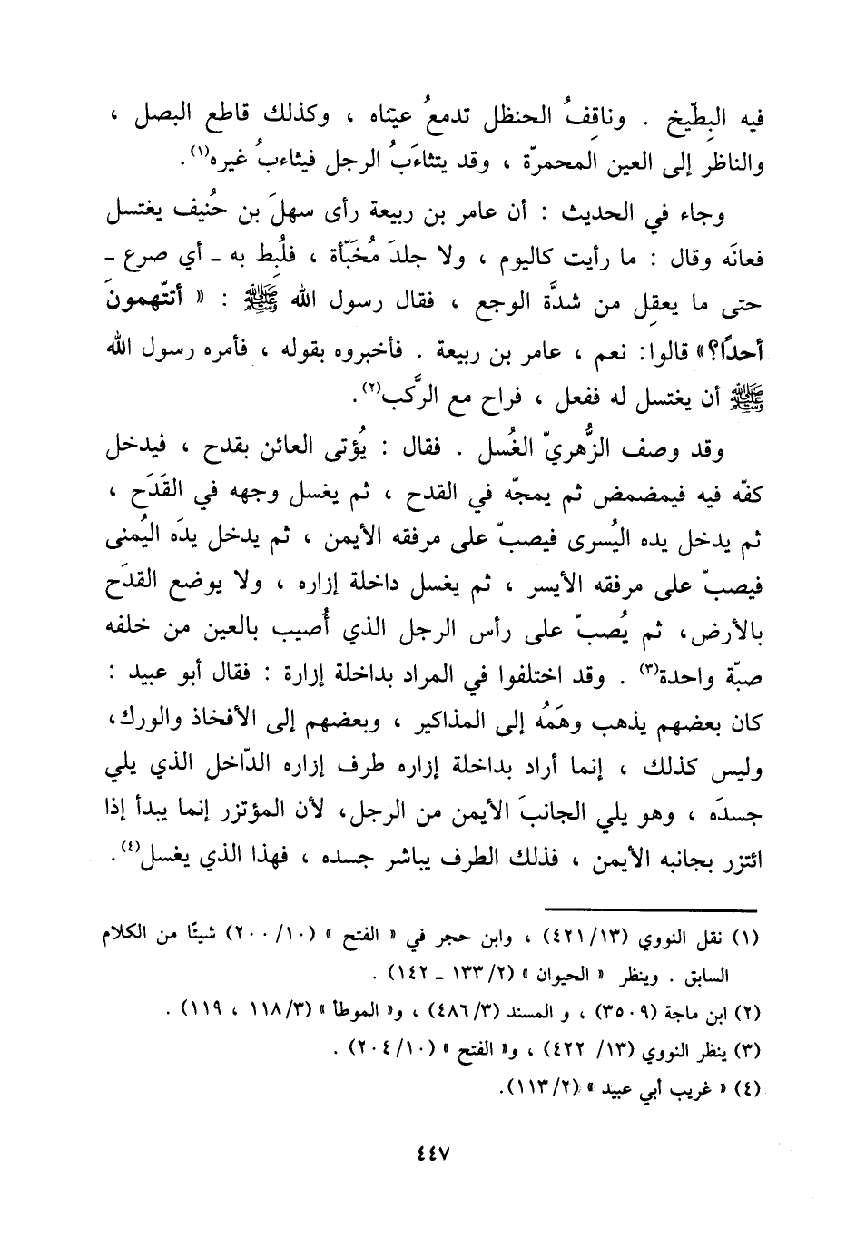 فِيهِ الْبِطِّيخ. وناقف الحنظل تَدْمَع عَيناهُ، وَكَذَلِكَ قَاطع البصل، والناظر إِلَى الْعين المحمرة، وَقد يتثاءب الرجل فيثاءب غَيره. [15] وَجَاء فِي الحَدِيث: أَن عَامر بن ربيعَة رأى سهل بن حنيف يغْتَسل فعانه وَقَالَ: مَا رَأَيْت كَالْيَوْمِ، وَلَا جلد مخبأة، فلبط بِهِ - أَي صرع - حَتَّى مَا يعقل من شدَّة الوجع، فَقَالَ رَسُول الله صلى الله عَلَيْهِ وَسلم: " أتتهمون أحدا؟ " قَالُوا: نعم، عَامر بن ربيعَة. فأخبروه بقوله، فَأمره رَسُول الله صلى الله عَلَيْهِ وَسلم أَن يغْتَسل لَهُ فَفعل، فراح مَعَ الركب. [15] وَقد وصف الزُّهْرِيّ الْغسْل. فَقَالَ: يُؤْتى العائن بقدح، فَيدْخل كَفه فِيهِ فيمضمض ثمَّ يمجه فِي الْقدح، ثمَّ يغسل وَجهه فِي الْقدح، ثمَّ يدْخل يَده الْيُسْرَى فَيصب على مرفقه الْأَيْمن، ثمَّ يدْخل يَده الْيُمْنَى فَيصب على مرفقه الْأَيْسَر، ثمَّ يغسل دَاخل إزَاره، وَلَا يوضع الْقدح بِالْأَرْضِ، ثمَّ يصب على رَأس الرجل الَّذِي أُصِيب بِالْعينِ من خَلفه صبة وَاحِدَة. وَقد اخْتلفُوا فِي المُرَاد بداخلة إزارة: فَقَالَ أَبُو عبيد: كَانَ بَعضهم يذهب وهمه إِلَى المذاكير، وَبَعْضهمْ إِلَى الأفخاذ والورك، وَلَيْسَ كَذَلِك، إِنَّمَا أَرَادَ بداخله إزَاره طرف إزَاره الدَّاخِل الَّذِي يَلِي جسده، وَهُوَ يَلِي الْجَانِب الْأَيْمن من الرجل، لِأَن المؤتزر إِنَّمَا يبْدَأ إِذا ائتزر بجانبه الْأَيْمن، فَذَلِك الطّرف يُبَاشر جسده، فَهَذَا الَّذِي يغسل.