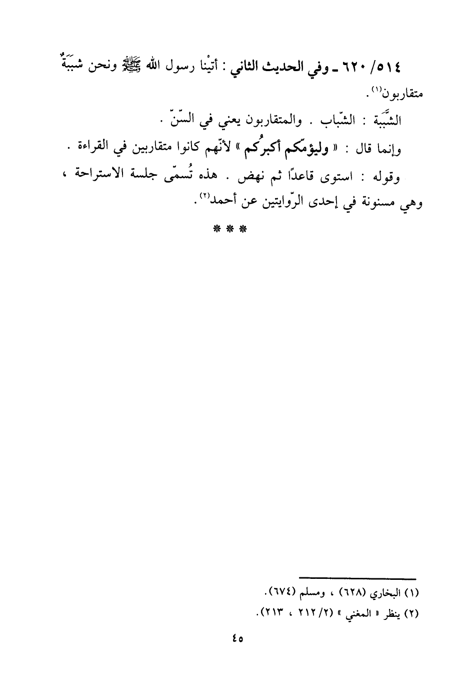 514 - / 620 وَفِي الحَدِيث الثَّانِي: أَتَيْنَا رَسُول الله صلى الله عَلَيْهِ وَسلم وَنحن شببة متقاربون. [15] الشببة: الشَّبَاب. والمتقاربون يَعْنِي فِي السن. [15] وَإِنَّمَا قَالَ: " وليؤمكم أكبركم " لأَنهم كَانُوا متقاربين فِي الْقِرَاءَة. [15] وَقَوله: اسْتَوَى قَاعِدا ثمَّ نَهَضَ. هَذِه تسمى جلْسَة الاسْتِرَاحَة، وَهِي مسنونة فِي إِحْدَى الرِّوَايَتَيْنِ عَن أَحْمد.