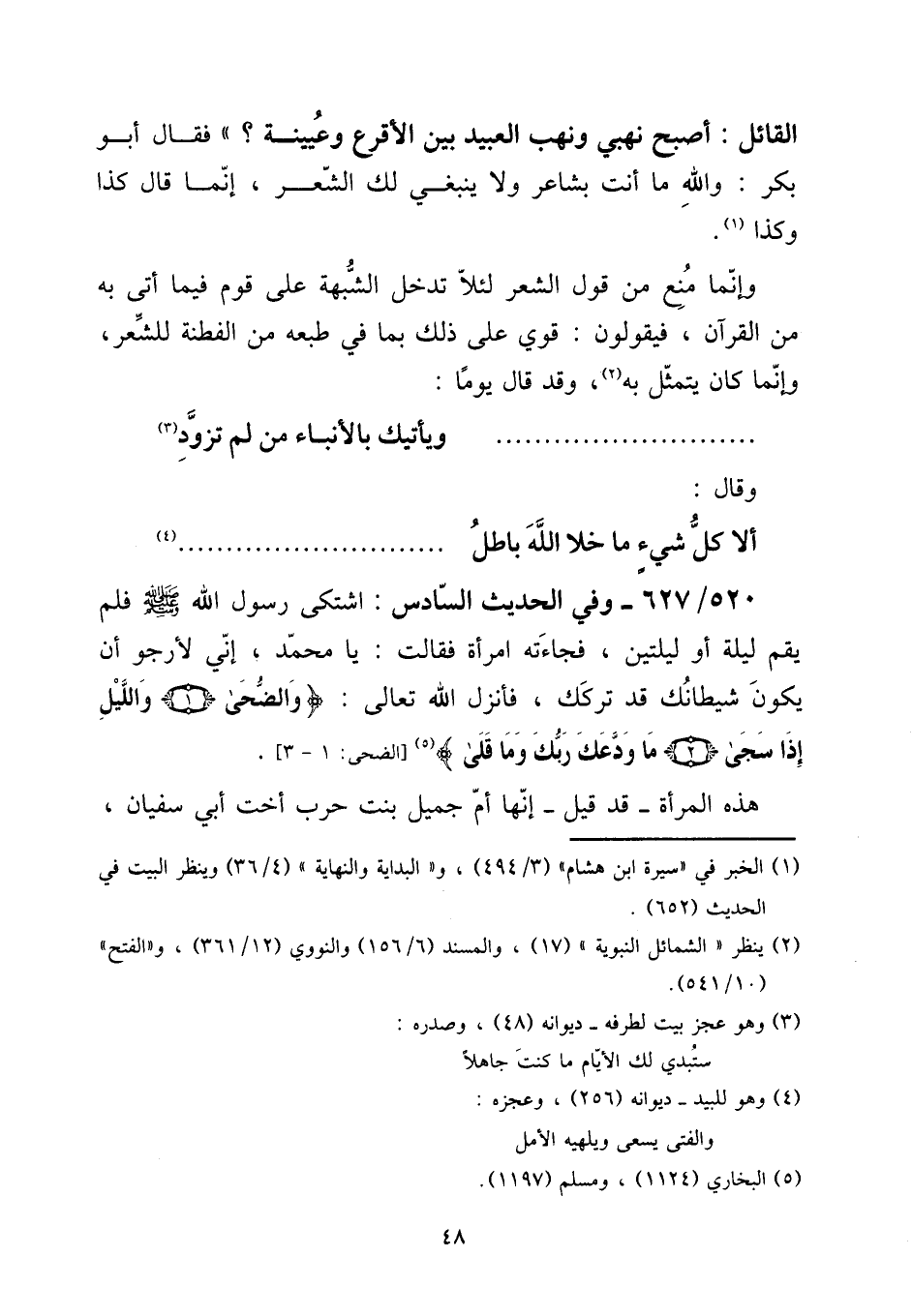 الْقَائِل: أصبح نَهْبي وَنهب العبيد بَين الْأَقْرَع وعيينة؟ " فَقَالَ أَبُو بكر: وَالله مَا أَنْت بشاعر وَلَا يَنْبَغِي لَك الشّعْر، إِنَّمَا قَالَ كَذَا وَكَذَا. [15] وَإِنَّمَا منع من قَول الشّعْر لِئَلَّا تدخل الشُّبْهَة على قوم فِيمَا أَتَى بِهِ من الْقُرْآن، فَيَقُولُونَ: قوي على ذَلِك بِمَا فِي طبعه من الفطنة للشعر، وَإِنَّمَا كَانَ يتَمَثَّل بِهِ، وَقد قَالَ يَوْمًا: