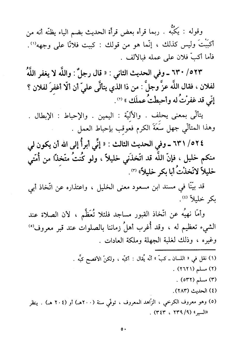 524 - / 631 و - فِي الحَدِيث الثَّالِث: " إِنِّي أَبْرَأ إِلَى الله أَن يكون لي مِنْكُم خَلِيل، فَإِن الله قد اتَّخَذَنِي خَلِيلًا، وَلَو كنت متخذا من أمتِي خَلِيلًا لاتخذت أَبَا بكر خَلِيلًا ". [15] قد بَينا فِي مُسْند ابْن مَسْعُود معنى الْخَلِيل، واعتذاره عَن اتِّخَاذ أبي بكر خَلِيلًا. [15] وَأما نَهْيه عَن اتِّخَاذ الْقُبُور مَسَاجِد فلئلا تعظم، لِأَن الصَّلَاة عِنْد الشَّيْء تَعْظِيم لَهُ، وَقد أغرب أهل زَمَاننَا بالصلوات عِنْد قبر مَعْرُوف وَغَيره، وَذَلِكَ لغَلَبَة الجهلة وملكة الْعَادَات.