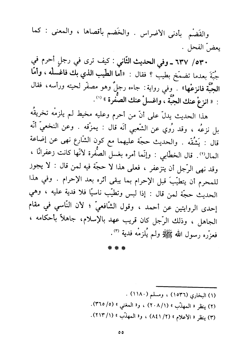 530 - / 637 وَفِي الحَدِيث الثَّانِي: كَيفَ ترى فِي رجل أحرم فِي جُبَّة بَعْدَمَا تضمخ بِطيب؟ فَقَالَ: " أما الطّيب الَّذِي بك فاغسله، وَأما الْجُبَّة فانزعها ". وَفِي رِوَايَة: جَاءَهُ رجل وَهُوَ مصفر لحيته وَرَأسه، فَقَالَ: " انْزعْ عَنْك الْجُبَّة، واغسل عَنْك الصُّفْرَة ". [15] هَذَا الحَدِيث يدل على أَن من أحرم وَعَلِيهِ مخيط لم يلْزمه تخريقه بل نَزعه، وَقد رُوِيَ عَن الشّعبِيّ أَنه قَالَ: يمزقه. وَعَن النَّخعِيّ أَنه قَالَ: يشقه. والْحَدِيث حجَّة عَلَيْهِمَا مَعَ كَون الشَّارِع نهى عَن إِضَاعَة المَال. قَالَ الْخطابِيّ: وَإِنَّمَا أمره بِغسْل الصُّفْرَة لِأَنَّهَا كَانَت زعفرانا، وَقد نهى الرجل أَن يتزعفر، فعلى هَذَا لَا حجَّة فِيهِ لمن قَالَ: لَا يجوز للْمحرمِ أَن يتطيب قبل الْإِحْرَام بِمَا يبْقى أَثَره بعد الْإِحْرَام. وَفِي هَذَا الحَدِيث حجَّة لمن قَالَ: إِذا لبس وتطيب نَاسِيا فَلَا فديَة عَلَيْهِ، وَهِي إِحْدَى الرِّوَايَتَيْنِ عَن أَحْمد، وَقَول الشَّافِعِي؛ لِأَن النَّاسِي فِي مقَام الْجَاهِل، وَذَلِكَ الرجل كَانَ قريب عهد بِالْإِسْلَامِ، جَاهِلا بأحكامه، فعزره رَسُول الله صلى الله عَلَيْهِ وَسلم وَلم يلْزمه فديَة.