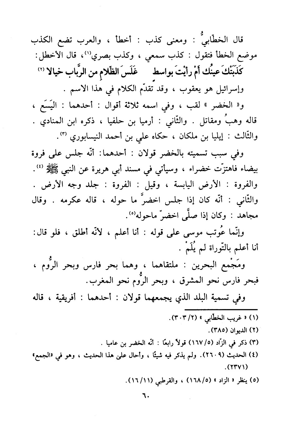 [15] وَإِسْرَائِيل هُوَ يَعْقُوب، وَقد تقدم الْكَلَام فِي هَذَا الِاسْم. [15] و " الْخضر " لقب، وَفِي اسْمه ثَلَاثَة أَقْوَال: أَحدهمَا: اليسع، قَالَه وهب وَمُقَاتِل. وَالثَّانِي: أرميا بن حلفيا، ذكره ابْن الْمُنَادِي. وَالثَّالِث: إيليا بن ملكان، حَكَاهُ عَليّ بن أَحْمد النَّيْسَابُورِي. [15] وَفِي سَبَب تَسْمِيَته بالخضر قَولَانِ: أَحدهمَا: أَنه جلس على فَرْوَة بَيْضَاء فاهتزت خضراء، وَسَيَأْتِي فِي مُسْند أبي هُرَيْرَة عَن النَّبِي صلى الله عَلَيْهِ وَسلم. والفروة: الأَرْض الْيَابِسَة، وَقيل: الفروة: جلد وَجه الأَرْض. وَالثَّانِي: أَنه كَانَ إِذا جلس اخضر مَا حوله، قَالَه عِكْرِمَهْ. وَقَالَ مُجَاهِد: وَكَانَ إِذا صلى اخضر مَا حوله. [15] وَإِنَّمَا عوتب مُوسَى على قَوْله: أَنا أعلم، لِأَنَّهُ أطلق، فَلَو قَالَ: أَنا أعلم بِالتَّوْرَاةِ لم يلم. [15] وَمجمع الْبَحْرين: ملتقاهما، وهما بَحر فَارس وبحر الرّوم، فبحر فَارس نَحْو الْمشرق، وبحر الرّوم نَحْو الْمغرب. [15] وَفِي تَسْمِيَة الْبَلَد الَّذِي يجمعهما قَولَانِ: أَحدهمَا أفريقية، قَالَه