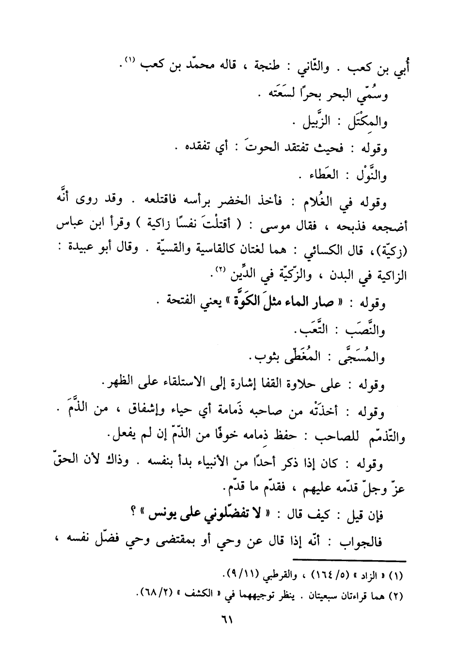 أبي بن كَعْب. وَالثَّانِي: طنجة، قَالَه مُحَمَّد بن كَعْب. وَسمي الْبَحْر بحراً لسعته. والمكتل: الزبيل. وَقَوله: فَحَيْثُ تفتقد الْحُوت: أَي تفقده. والنول: الْعَطاء. [15] وَقَوله فِي الْغُلَام: فَأخذ الْخضر بِرَأْسِهِ فاقتلعه. وَقد روى أَنه أضجعه فذبحه، فَقَالَ مُوسَى (أقتلت نفسا زاكية) وَقَرَأَ ابْن عَبَّاس (زكية) ، قَالَ الْكسَائي: هما لُغَتَانِ كالقاسية والقسية. وَقَالَ أَبُو عُبَيْدَة: الزاكية فِي الْبدن، والزكية فِي الدّين. [15] وَقَوله: " صَار المَاء مثل الكوة " يَعْنِي الفتحة. [15] وَالنّصب: التَّعَب. [15] والمسجى: المغطى بِثَوْب. [15] وَقَوله: على حلاوة الْقَفَا إِشَارَة إِلَى الاستلقاء على الظّهْر. [15] وَقَوله: أَخَذته من صَاحبه ذمَامَة أَي حَيَاء وإشفاق، من الذَّم. والتذمم للصاحب: حفظ ذمَامَة خوفًا من الذَّم إِن لم يفعل. [15] وَقَوله: كَانَ إِذا ذكر أحدا من الْأَنْبِيَاء بَدَأَ بِنَفسِهِ. وَذَاكَ لِأَن الْحق عز وَجل قدمه عَلَيْهِم، فَقدم مَا قدم. [15] فَإِن قيل: كَيفَ قَالَ: " لَا تفضلُونِي على يُونُس "؟ [15] فَالْجَوَاب: أَنه إِذا قَالَ عَن وَحي أَو بِمُقْتَضى وَحي فضل نَفسه،