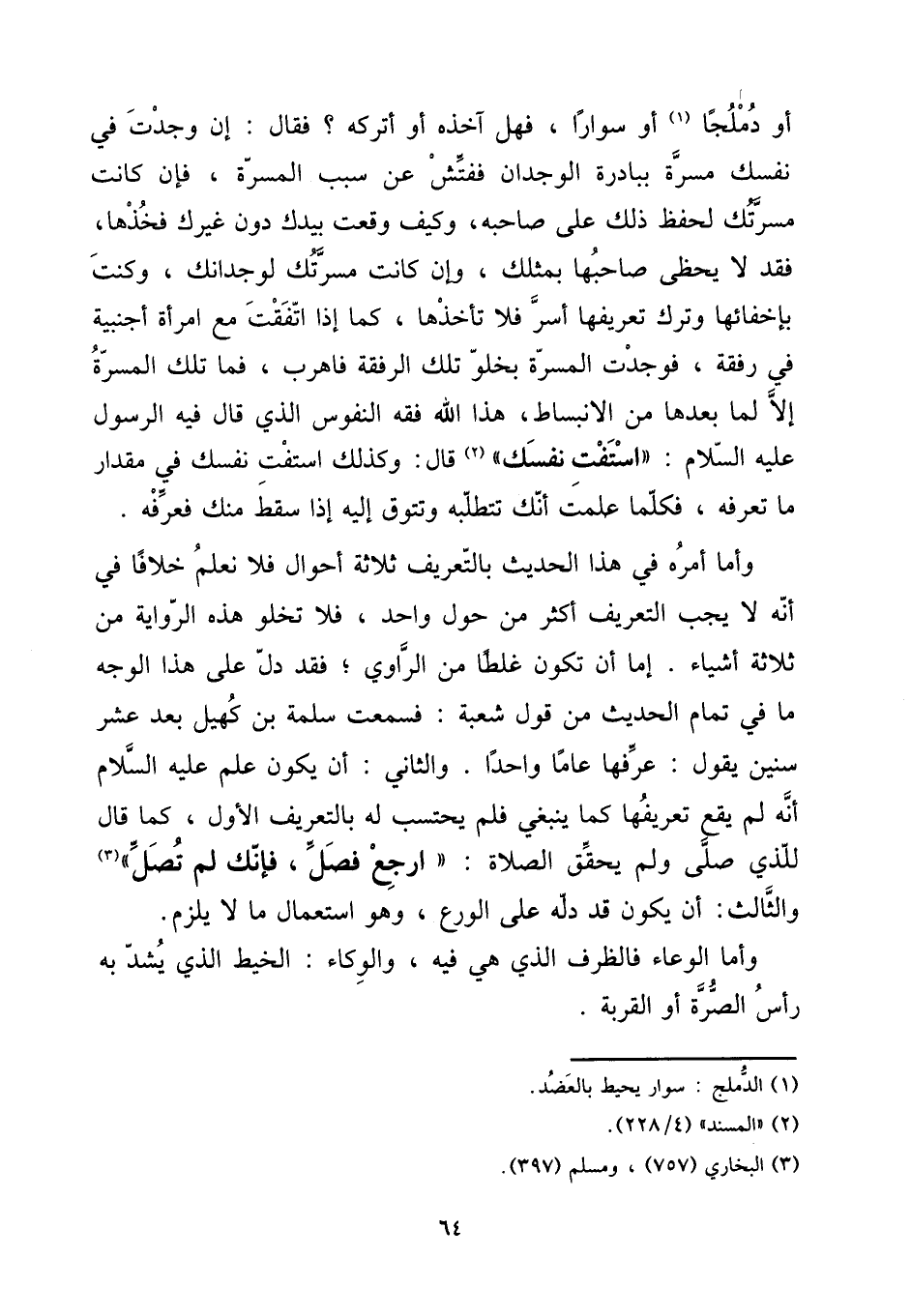 أَو دملجا أَو سوارا، فَهَل آخذه أم أتركه؟ فَقَالَ: إِن وجدت فِي نَفسك مَسَرَّة ببادرة الوجدان ففتش عَن سَبَب المسرة، فَإِن كَانَت مسرتك لحفظ ذَلِك على صَاحبه، وَكَيف وَقعت بِيَدِك دون غَيْرك فَخذهَا، فقد لَا يحظى صَاحبهَا بمثلك، وَإِن كَانَت مسرتك لوجدانك، وَكنت بإخفائها وَترك تَعْرِيفهَا أسر فَلَا تأخذها، كَمَا إِذا اتّفقت مَعَ امْرَأَة أَجْنَبِيَّة فِي رفْقَة، فَوجدت المسرة بخلو تِلْكَ الرّفْقَة فاهرب، فَمَا تِلْكَ المسرة إِلَّا لما بعْدهَا من الانبساط، هَذَا الله فقه النُّفُوس الَّذِي قَالَ فِيهِ الرَّسُول عَلَيْهِ السَّلَام: " استفت نَفسك " قَالَ: وَكَذَلِكَ استفت نَفسك فِي مِقْدَار مَا تعرفه فَكلما علمت أَنَّك تتطلبه وتتوق إِلَيْهِ إِذا سقط مِنْك فَعرفهُ. [15] وَأما أمره فِي هَذَا الحَدِيث بالتعريف ثَلَاثَة أَحْوَال فَلَا نعلم خلافًا فِي أَنه لَا يجب التَّعْرِيف أَكثر من حول وَاحِد، فَلَا تَخْلُو هَذِه الرِّوَايَة من ثَلَاثَة أَشْيَاء. أما أَن تكون غَلطا من الرَّاوِي؛ فقد دلّ على هَذَا الْوَجْه مَا فِي تَمام الحَدِيث من قَول شُعْبَة: فَسمِعت سَلمَة بن كهيل بعد عشر سِنِين يَقُول: عرفهَا عَاما وَاحِدًا. وَالثَّانِي: أَن يكون علم عَلَيْهِ السَّلَام أَنه لم يَقع تَعْرِيفهَا كَمَا يَنْبَغِي فَلم يحْتَسب لَهُ بالتعريف الأول، كَمَا قَالَ للَّذي صلى وَلم يُحَقّق الصَّلَاة: " ارْجع فصل، فَإنَّك لم تصل " وَالثَّالِث: أَن يكون قد دله على الْوَرع، وَهُوَ اسْتِعْمَال مَا لَا يلْزم. [15] وَأما الْوِعَاء فالظرف الَّذِي هِيَ فِيهِ، والوكاء: الْخَيط الَّذِي يشد بِهِ رَأس الصرة أَو الْقرْبَة